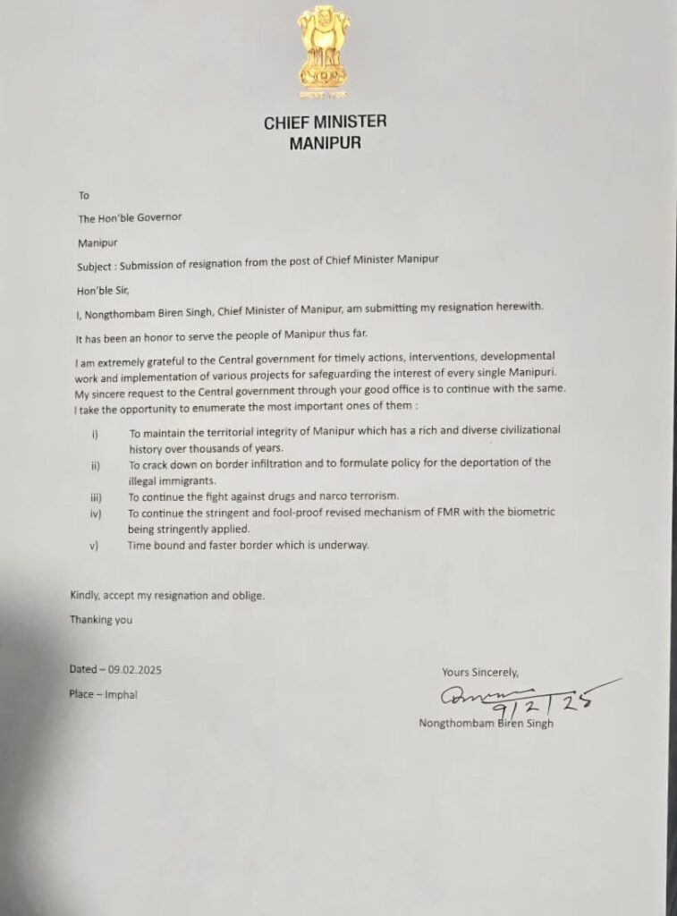 - एन बीरेन सिंह ने राज्यपाल को अपना इस्तीफा सौंप दिया