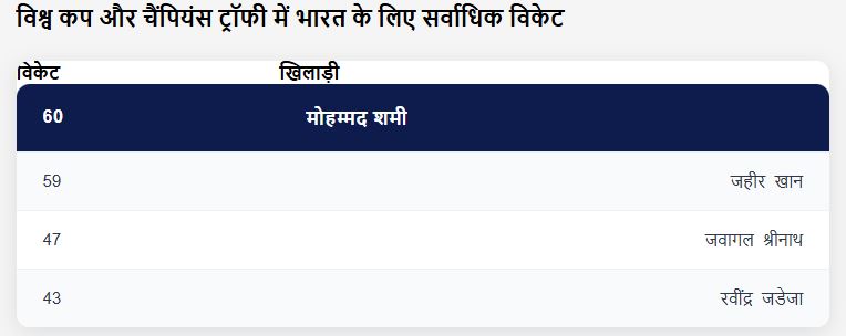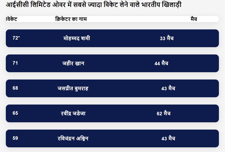 शमी लिमिटेड ओवर में भारत की ओर से सबसे ज्यादा विकेट लेने वाले गेंदबाज बन गए हैं। इस मामले में उन्होंने जहीर खान को पीछे छोड़ा, जिनके नाम 44 मैच में 71 विकेट दर्ज थे। लेकिन अब शमी 33 मैच में 72 विकेट लेकर अपने नाम बड़ी उपलब्धि दर्ज करा चुके हैं।