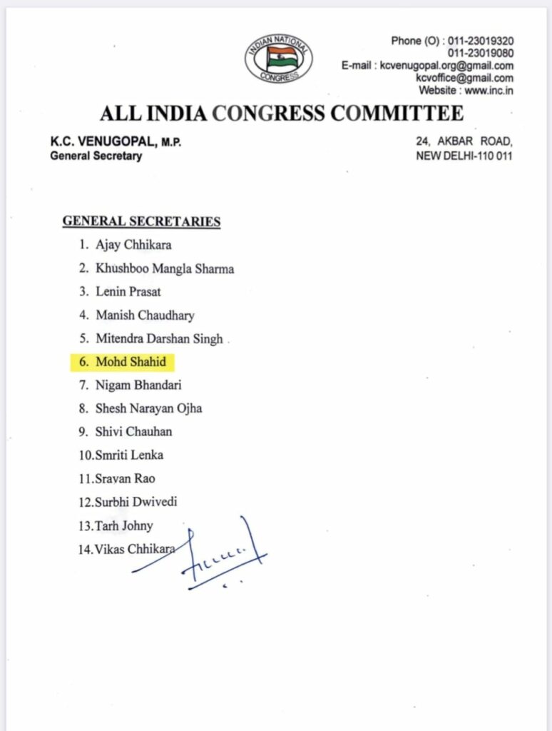 भिलाई : Bhilai News, कांग्रेस ने युवा कांग्रेस की राष्ट्रीय कार्यकारिणी की घोषणा कर दी है। जारी सूची के अनुसार छत्तीसगढ़ से मोहम्मद शाहिद राष्ट्रीय महासचिव बनाए गए हैं। मोहम्मद शाहिद भिलाई के रहने वाले हैं। इस सूची में 14 महासचिवों की नियुक्ति की गई है। जिसमें से 6वें नंबर पर मोहम्मद शहिद का नाम है। मोहम्मद शाहिद यूथ कांग्रेस के राष्ट्रीय सचिव भी रह चुके हैं।