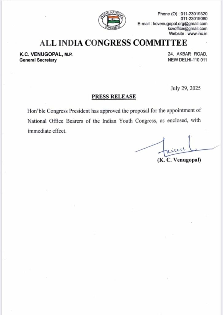 यूथ कांग्रेस की राष्ट्रीय कार्यकारिणी में 14 राष्ट्रीय महासचिव और 62 राष्ट्रीय सचिवों की घोषणा हुई है, कार्यकारिणी में 8 जॉइंट सेक्रेटरी बनाए गए हैं। संगठन महासचिव केसी वेणुगोपाल ने यह सूची जारी की है।