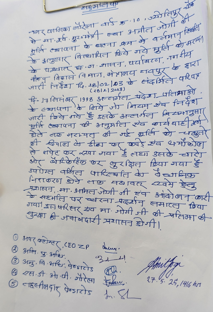 पेंड्रा: Pendra News छत्तीसगढ़ के पहले मुख्यमंत्री स्वर्गीय अजीत जोगी की प्रतिमा लगाने का विवाद आखिरकार आगामी प्रशासनिक निराकरण तक शांत हो गया है। फिलहाल अंतिम निर्णय तक प्रतिमा स्थल पर ही फिलहाल चबूतरे के नीचे ही अजीत जोगी की प्रतिमा को रख दिया गया है। और अब प्रतिमा और प्रतिमा स्थल दोनों की सुरक्षा की जिम्मेदारी प्रशासन की होगी। इसी के साथ ही कल से जारी अमित जोगी का धरना खत्म हो गया है। मजेदार बात यह है कि जिस कानून को मुख्यमंत्री रहते हुए अजीत जोगी ने बनाया था, वही कानून अब उनकी ही प्रतिमा लगाने में रोड़ा बन गया है।