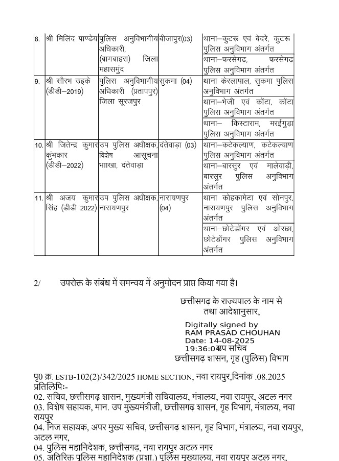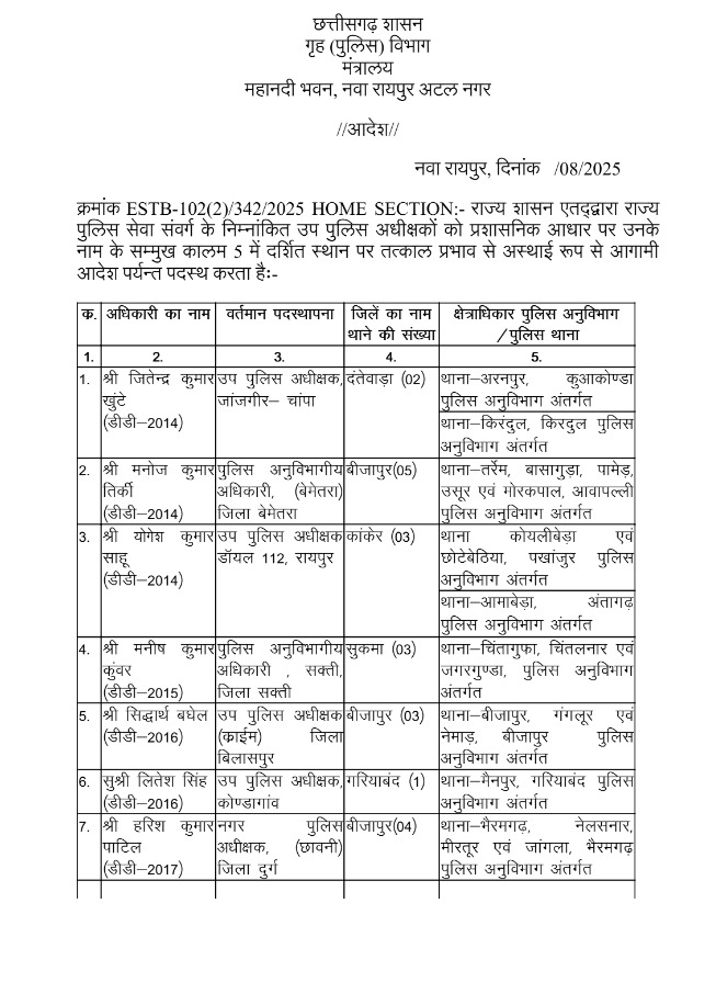 CG Police Transfer: गृह मंत्रालय ने राज्य पुलिस सेवा के 11 अधिकारियों के तबादला आदेश जारी किए हैं। 79वें स्वतंत्रता दिवस की पूर्व संध्या पर गृह मंत्रालय महानदी भवन द्वारा यह आदेश जारी किया गया है।