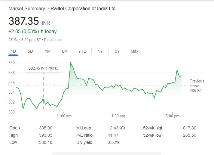 RailTel Corporation Share: आंध्र प्रदेश पुलिस ने अपनी सुरक्षा और निगरानी प्रणाली को और बेहतर बनाने के लिए नवरत्न कंपनी रेलटेल कॉर्पोरेशन ऑफ इंडिया को 25,12,94,570 रुपये का काम मिला है। इसके तहत कंपनी को 25 जून 2025 तक कार्य पूरा करना होगा। मंगलवार को बीएसई पर रेलटेल के शेयर 385.00 रुपये से खुले और दिन के दौरान इसका इंट्रा-डे हाई 393.05 रुपये तक पहुंचा।