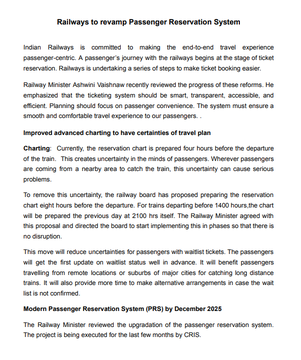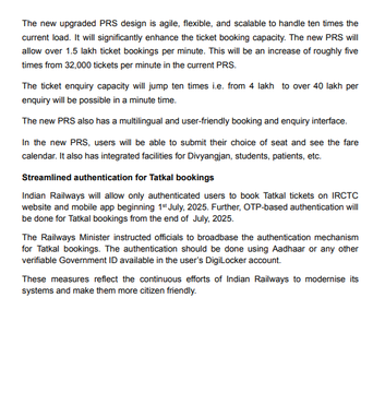 Railways changed the rules: 14:00 बजे से पहले प्रस्थान करने वाली ट्रेनों के लिए, चार्ट पिछले दिन 21:00 बजे तैयार किया जाएगा। नई PRS (यात्री आरक्षण प्रणाली) प्रति मिनट 1.5 लाख से अधिक टिकट बुकिंग की अनुमति देगी।