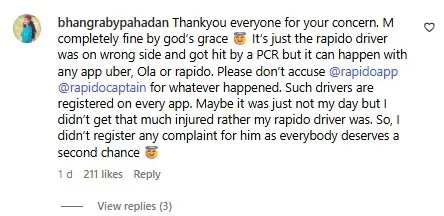 रैपिडो की प्रतिक्रिया के बाद प्रियंका ने दोबारा पोस्ट करते हुए कहा, कि “मैं रैपिडो को दोष नहीं देती। ऐसे लापरवाह ड्राइवर सभी ऐप्स पर मौजूद हैं। मेरे ड्राइवर को मुझसे ज्यादा चोटें आई थीं, इसलिए मैंने उसके खिलाफ शिकायत नहीं की। मुझे लगता है हर किसी को दूसरा मौका मिलना चाहिए।”