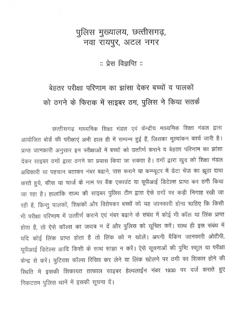 CG police issued advisory: रायपुर पुलिस को मिली शिकायतों के अनुसार, ठग परीक्षा में नंबर बढ़ाने, बच्चों को पास कराने या कम्प्यूटर सिस्टम में डेटा बदलने का झूठा दावा करते हुए फीस या चार्ज के नाम पर बैंक खाता या यूपीआई डिटेल्स मांग रहे हैं।