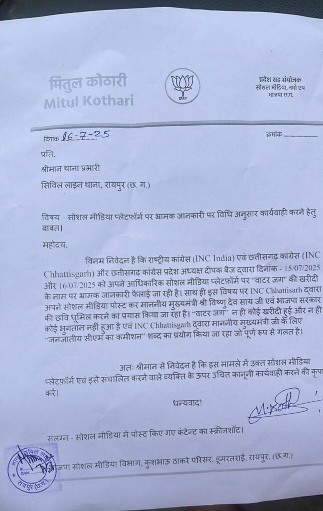 बलौदा बाजार: CG News , आदिवासी विकास विभाग के खिलाफ ₹51,99,920.00 रुपए की स्टील वाटर जग खरीदी को लेकर बड़ा विवाद खड़ा हो गया है। कांग्रेस ने सोशल मीडिया पर एक रसीद वायरल करते हुए इसे कथित “भ्रष्टाचार का घिनौना उदाहरण” बताया। जिसके बाद आज BJP सोशल मीडिया सह संयोजक मितुल कोठारी ने इस मामले में थाने में शिकायत की है। PCC दीपक बैज पर कानूनी कार्रवाई करने सिविल लाइन थाने में शिकायत की गई है।
