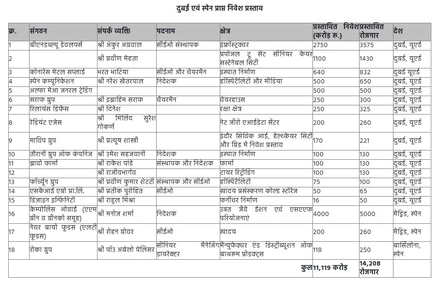 मुख्यमंत्री डॉ. मोहन यादव की स्पेन और दुबई यात्रा में 11 हजार 119 करोड़ से अधिक के निवेश प्रस्ताव प्राप्त हुए हैं जिससे 14 हजार से अधिक व्यक्तियों को रोजगार भी प्राप्त होगा।