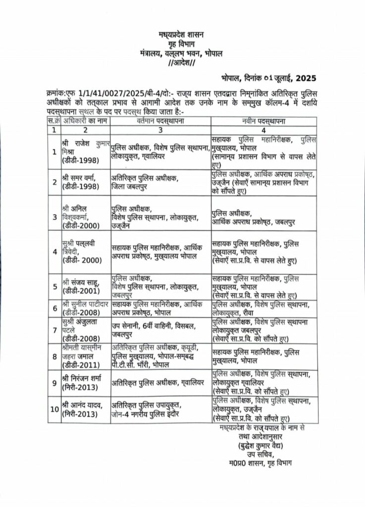 MP IPS Transfer list 1 july: देर रात जारी हुआ IPS अधिकारियों का तबादला आदेश, अनिल विश्वकर्मा बनाए गए जबलपुर EOW एसपी..देखें पूरी सूची