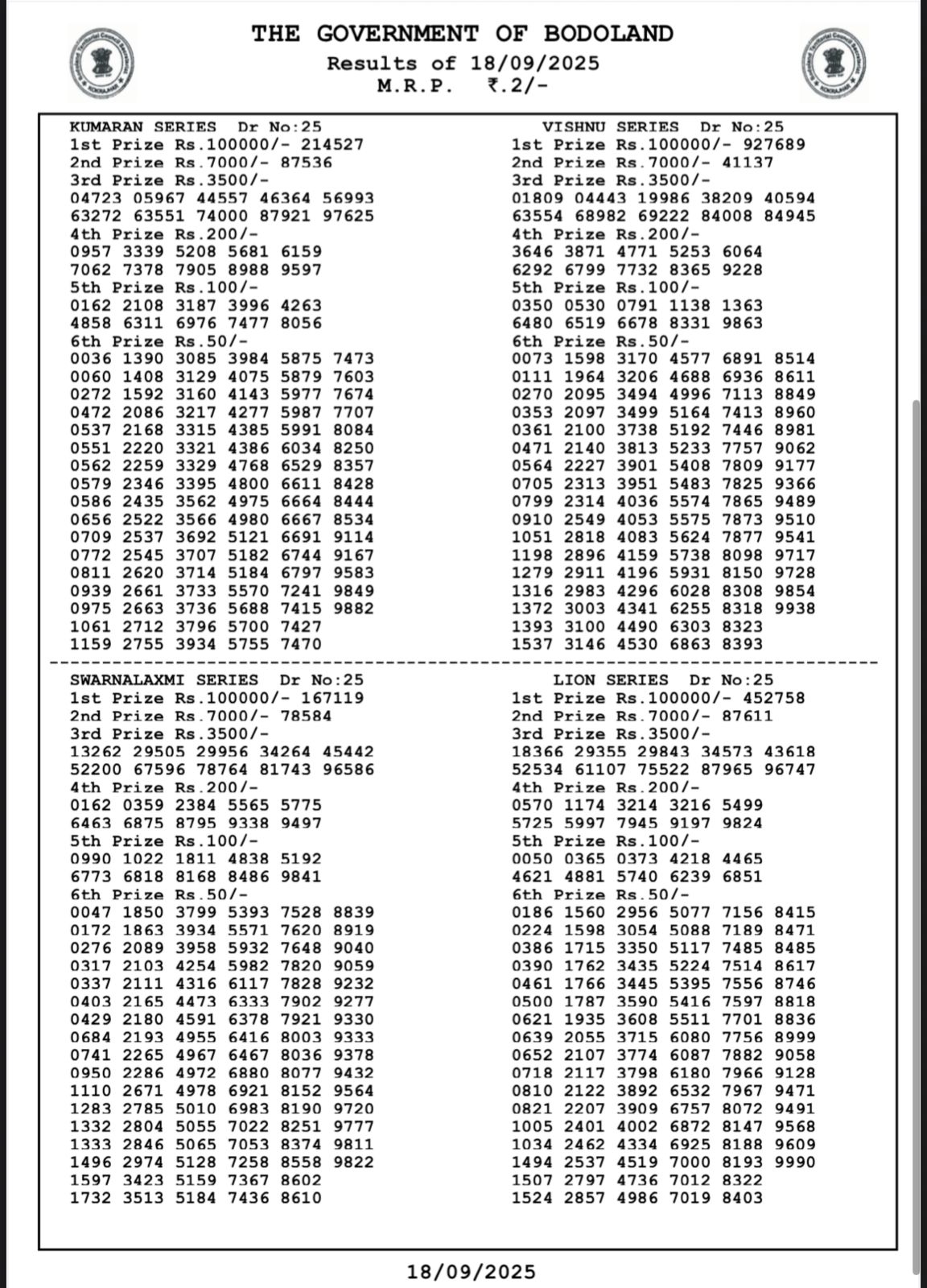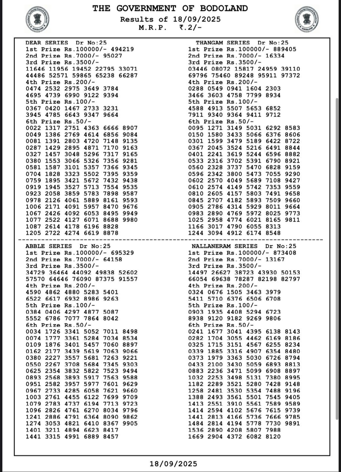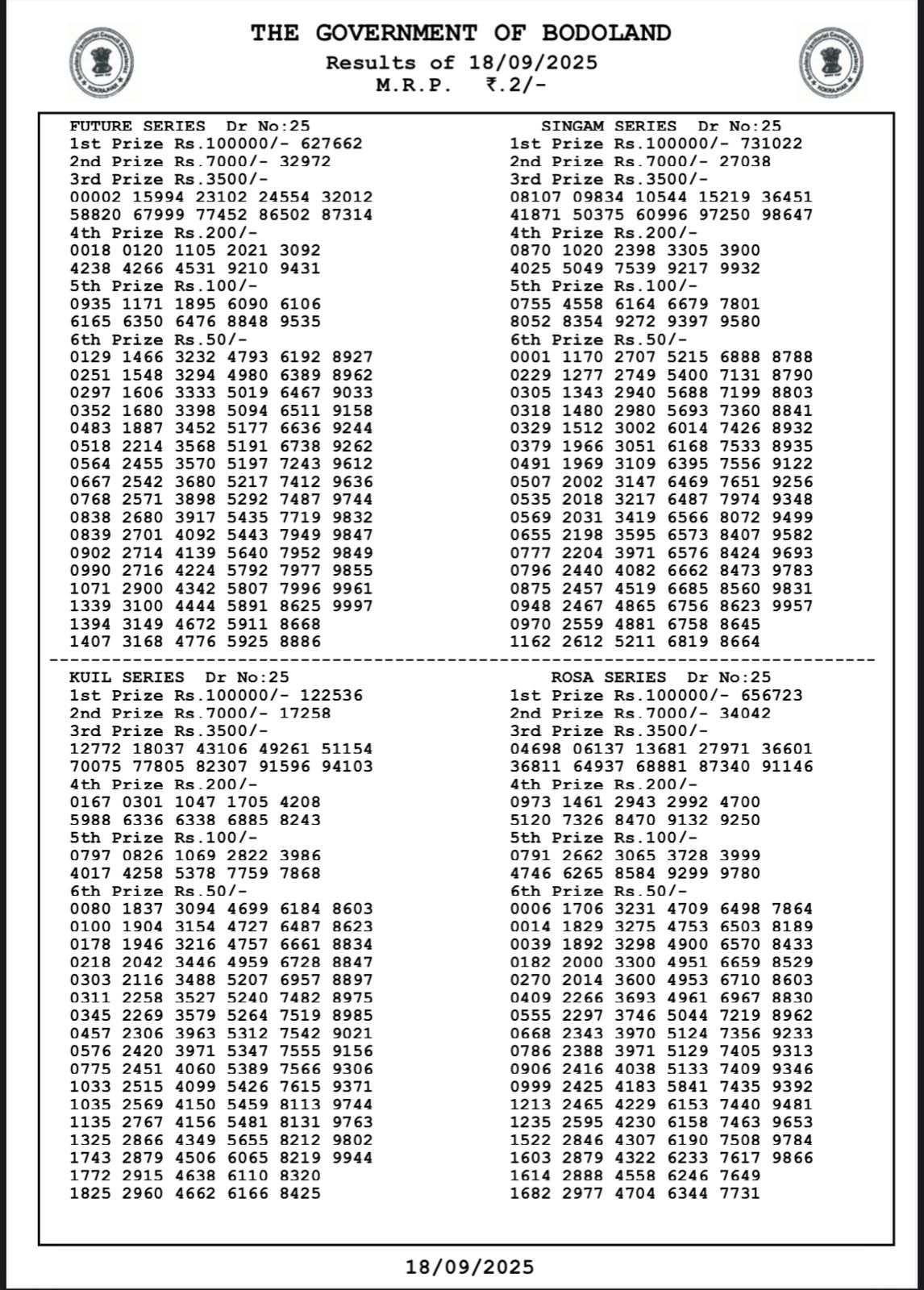 |Bodoland Lottery Sambad Result Today | 18-09-2025 |