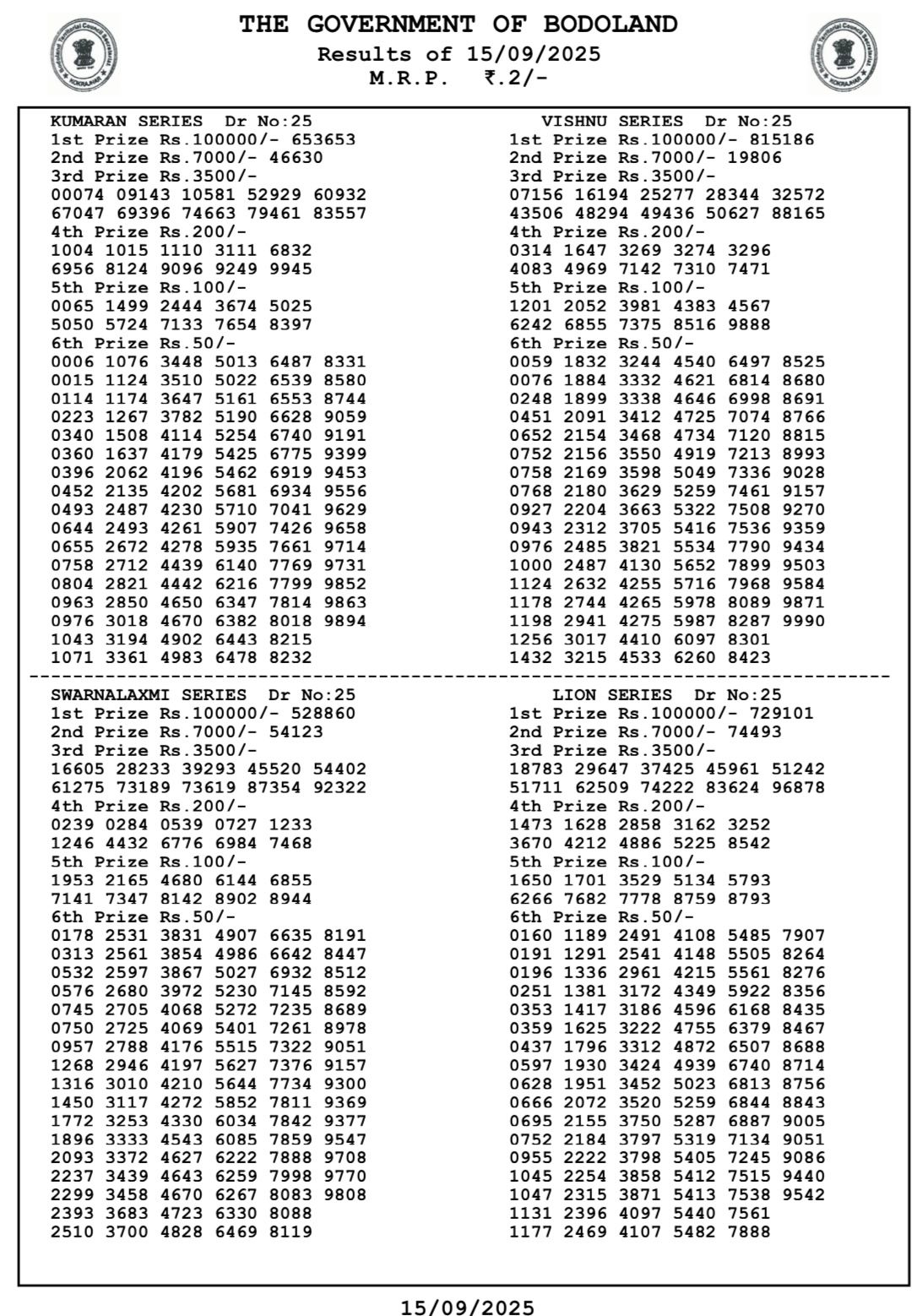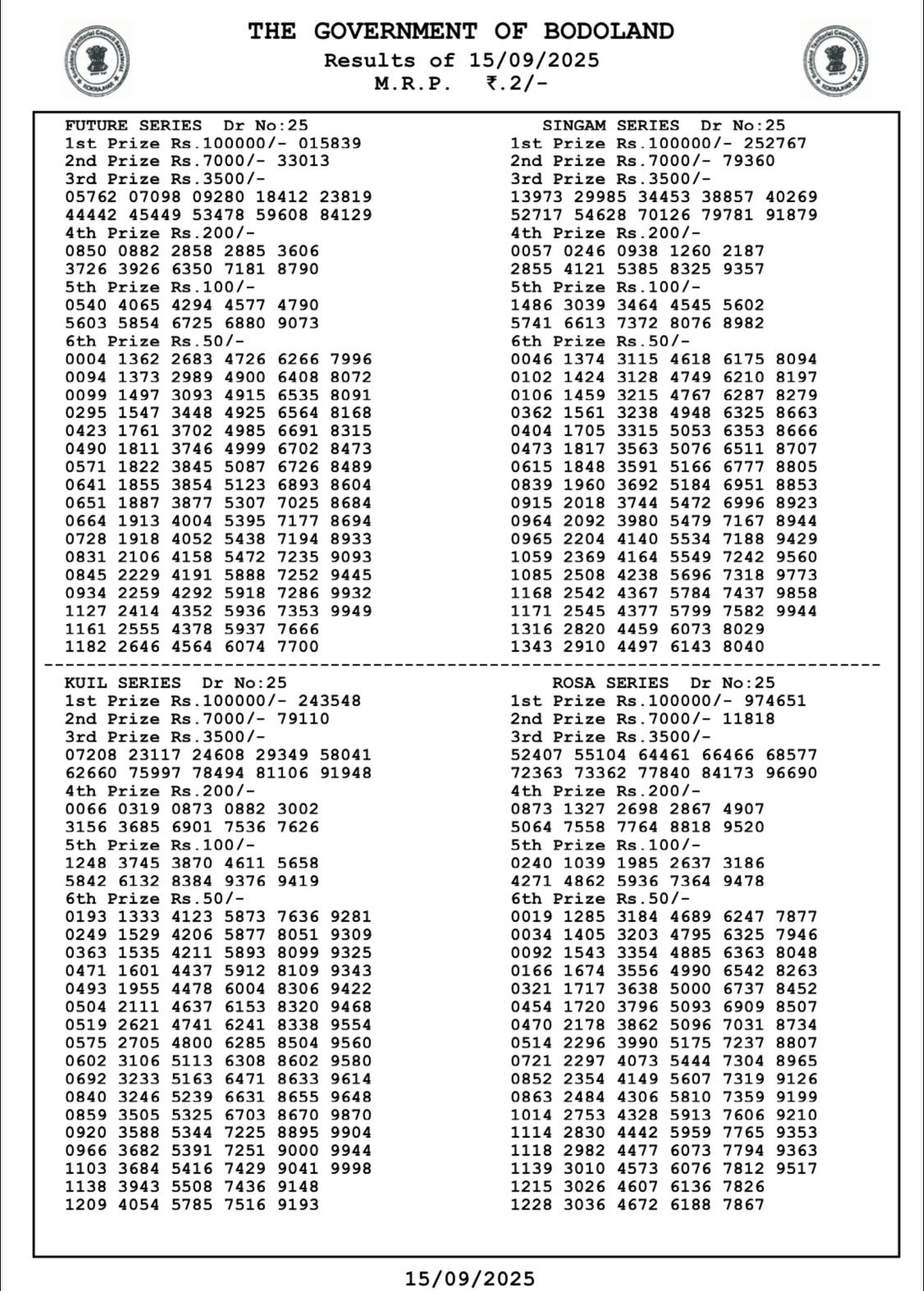 (OUT) Bodoland Lottery Sambad Result Today 15-09-2025