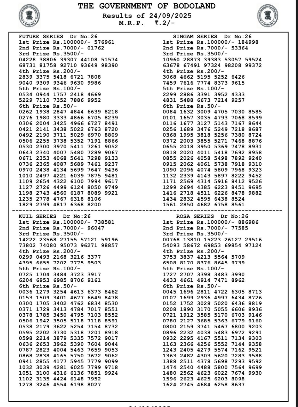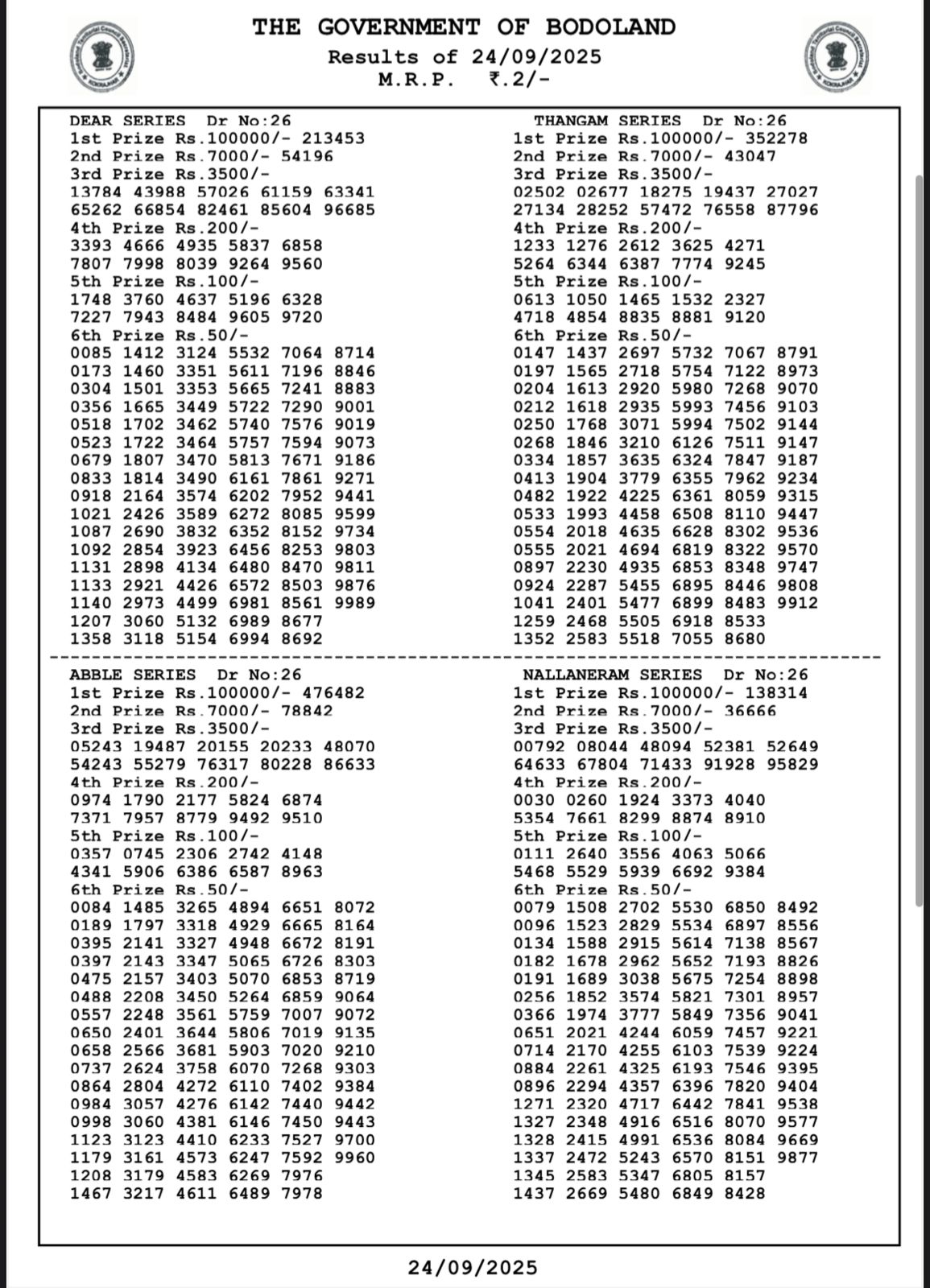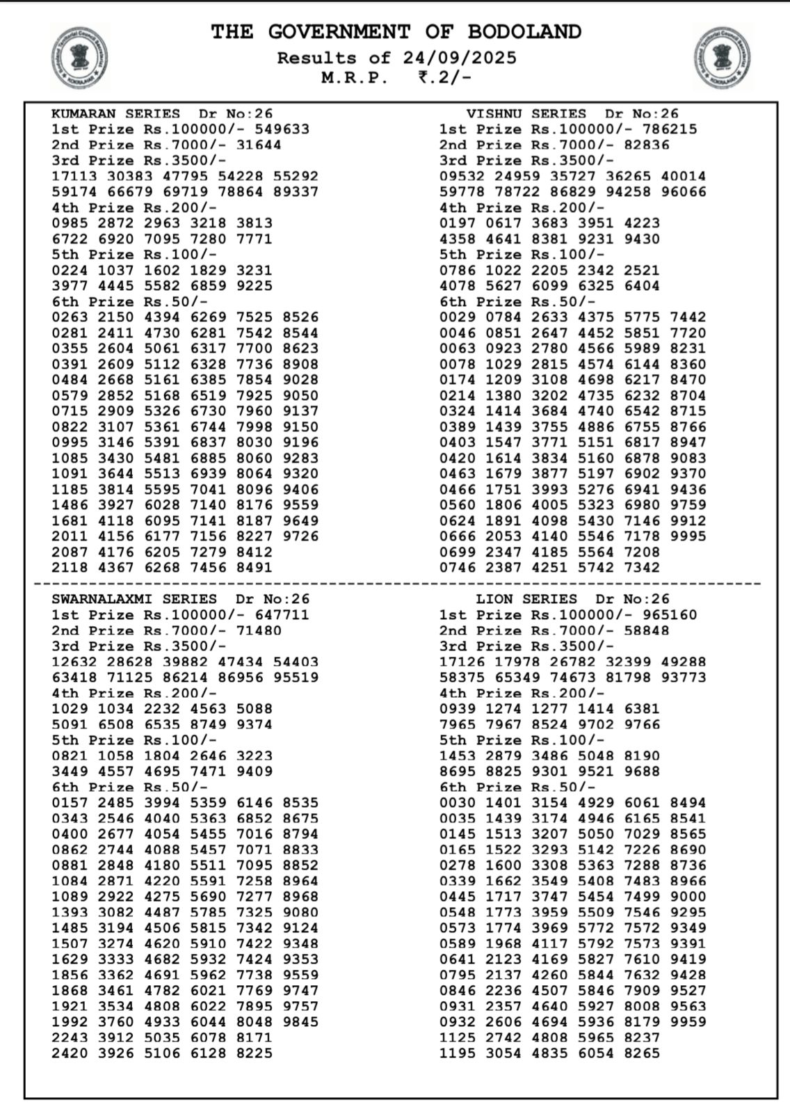 (LIVE) Bodoland Lottery Sambad Result Today 24-09-2025