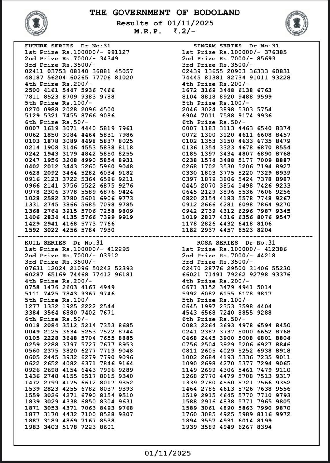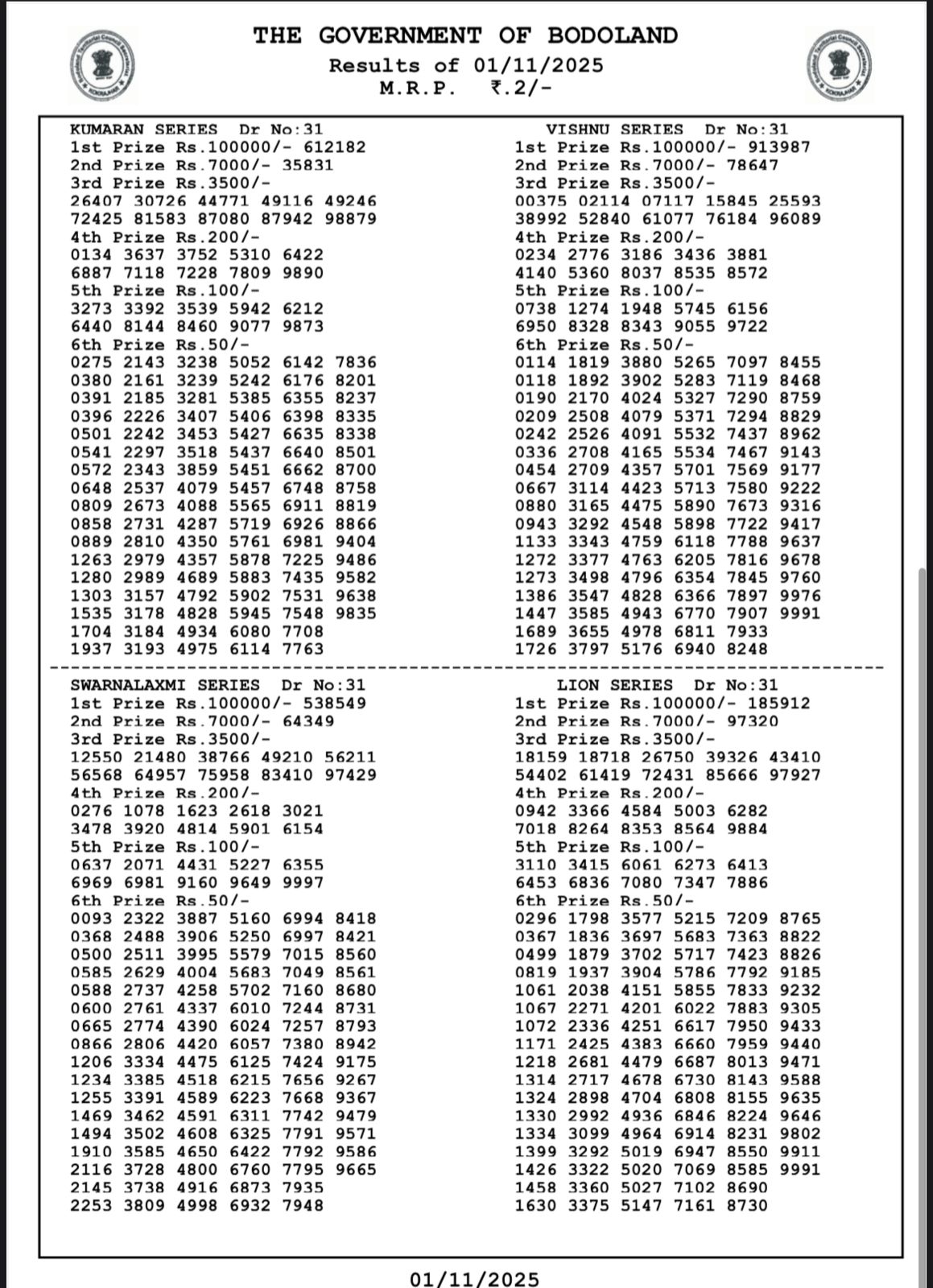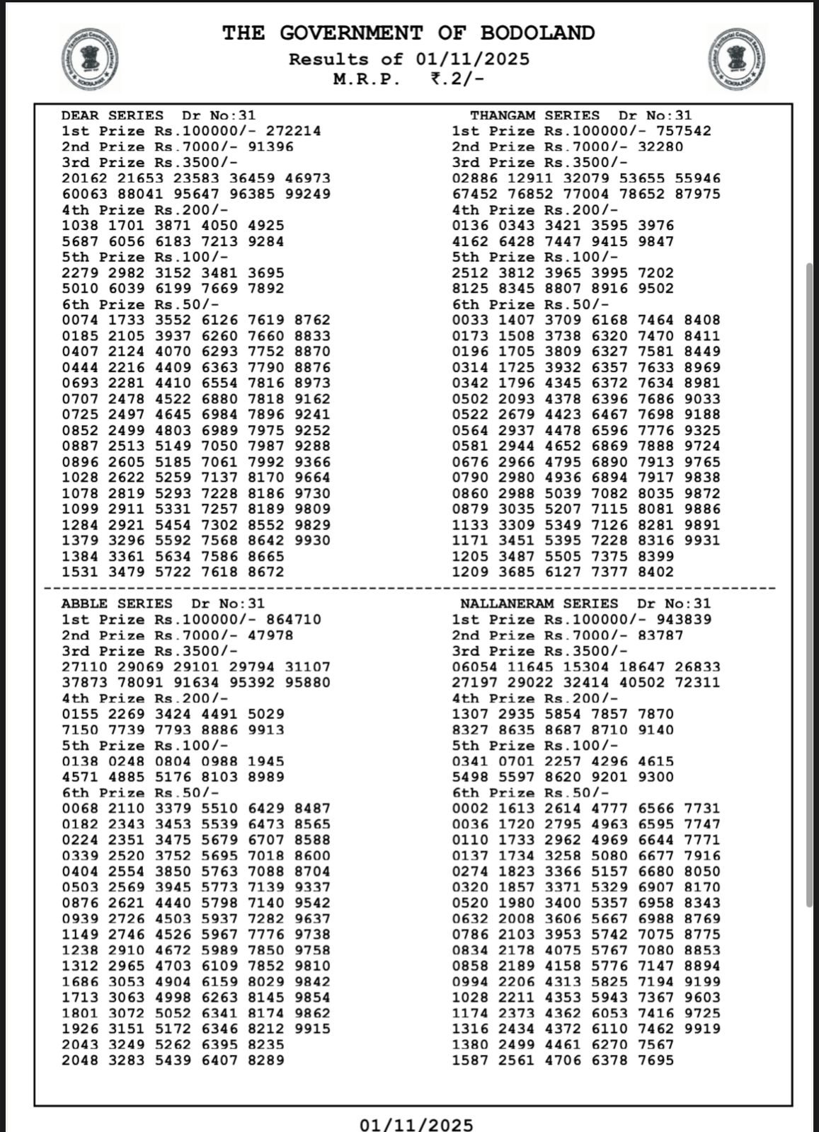 (LIVE) Bodoland Lottery Sambad Result 3 PM Today 01-11-2025: Lucky Draw DECLARED Check Winners List!