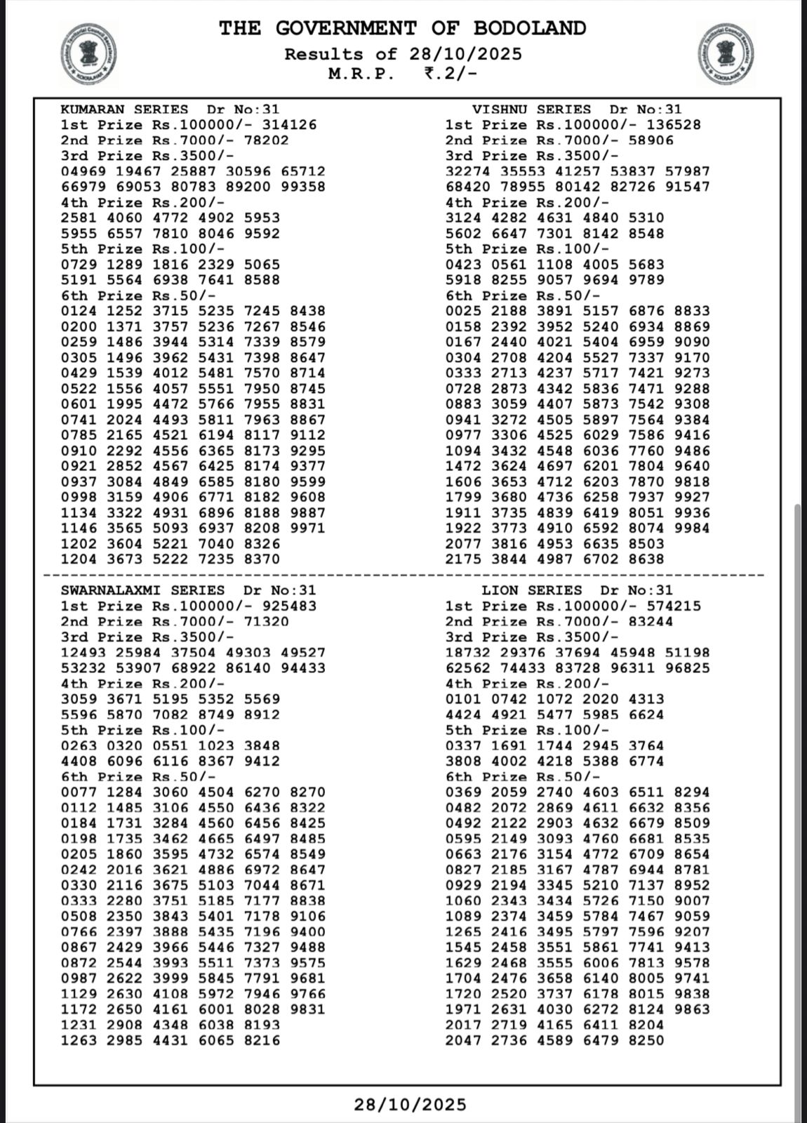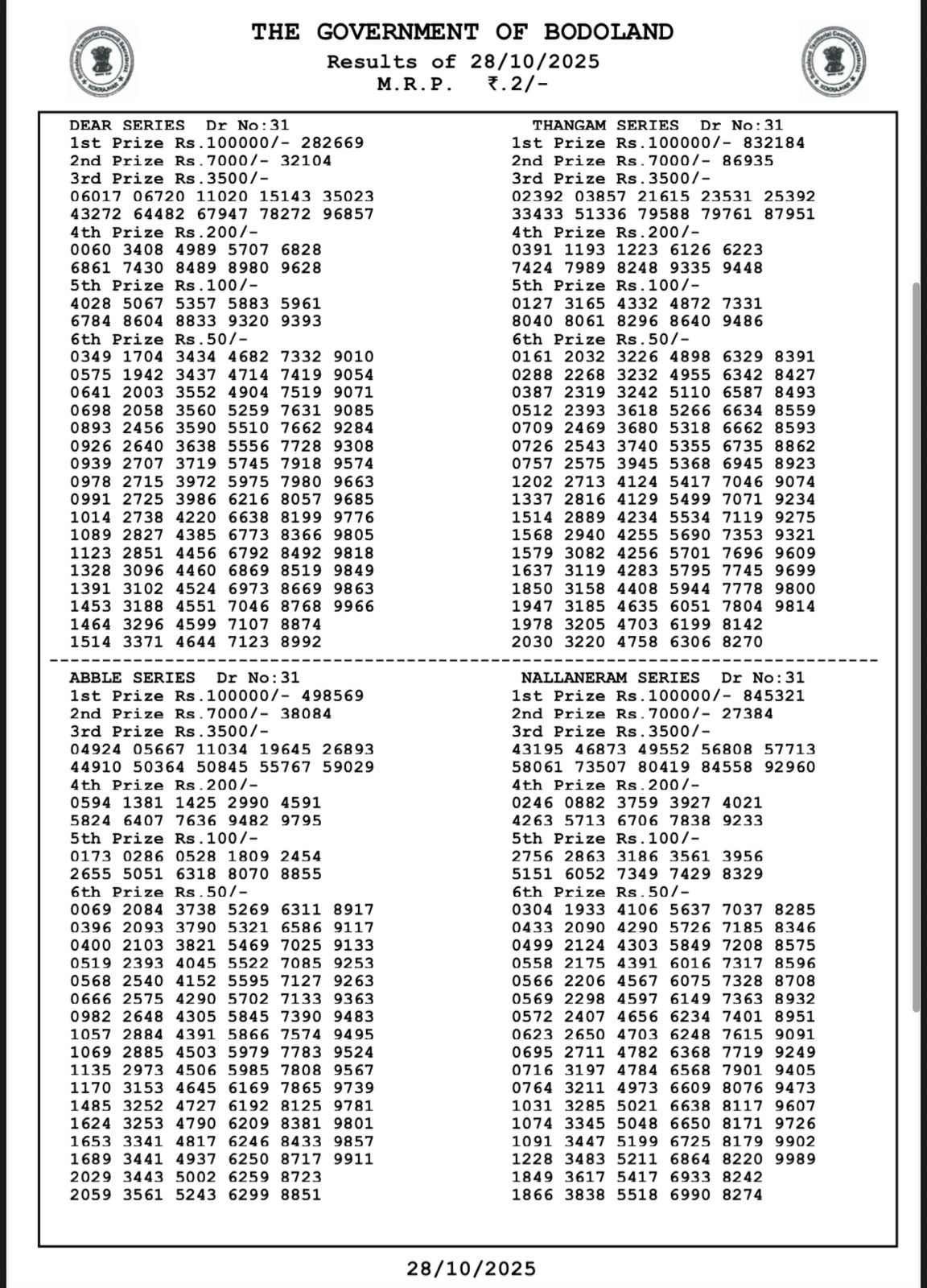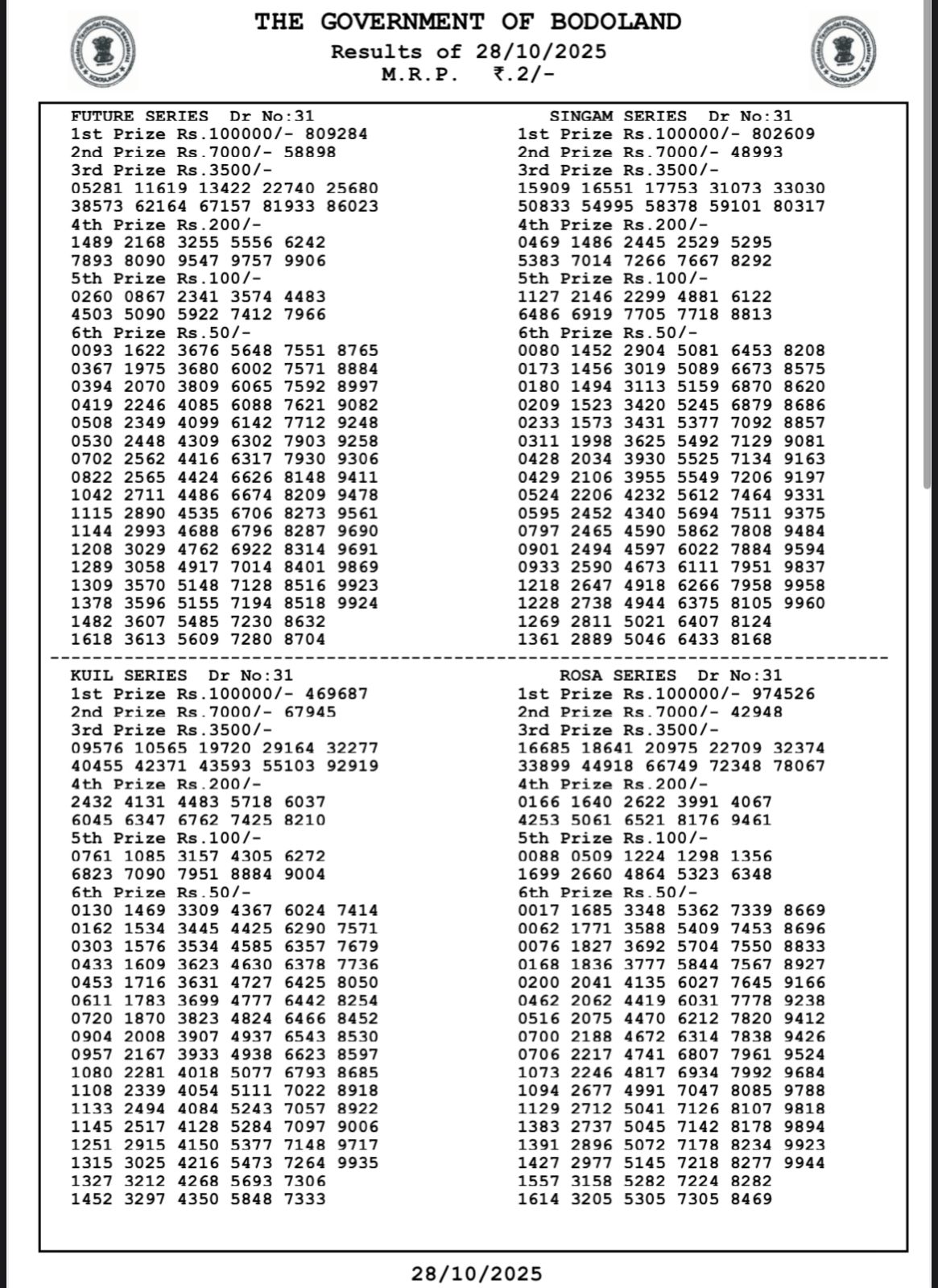 (LIVE) Bodoland Lottery Sambad Result 3 PM Today 28-10-2025