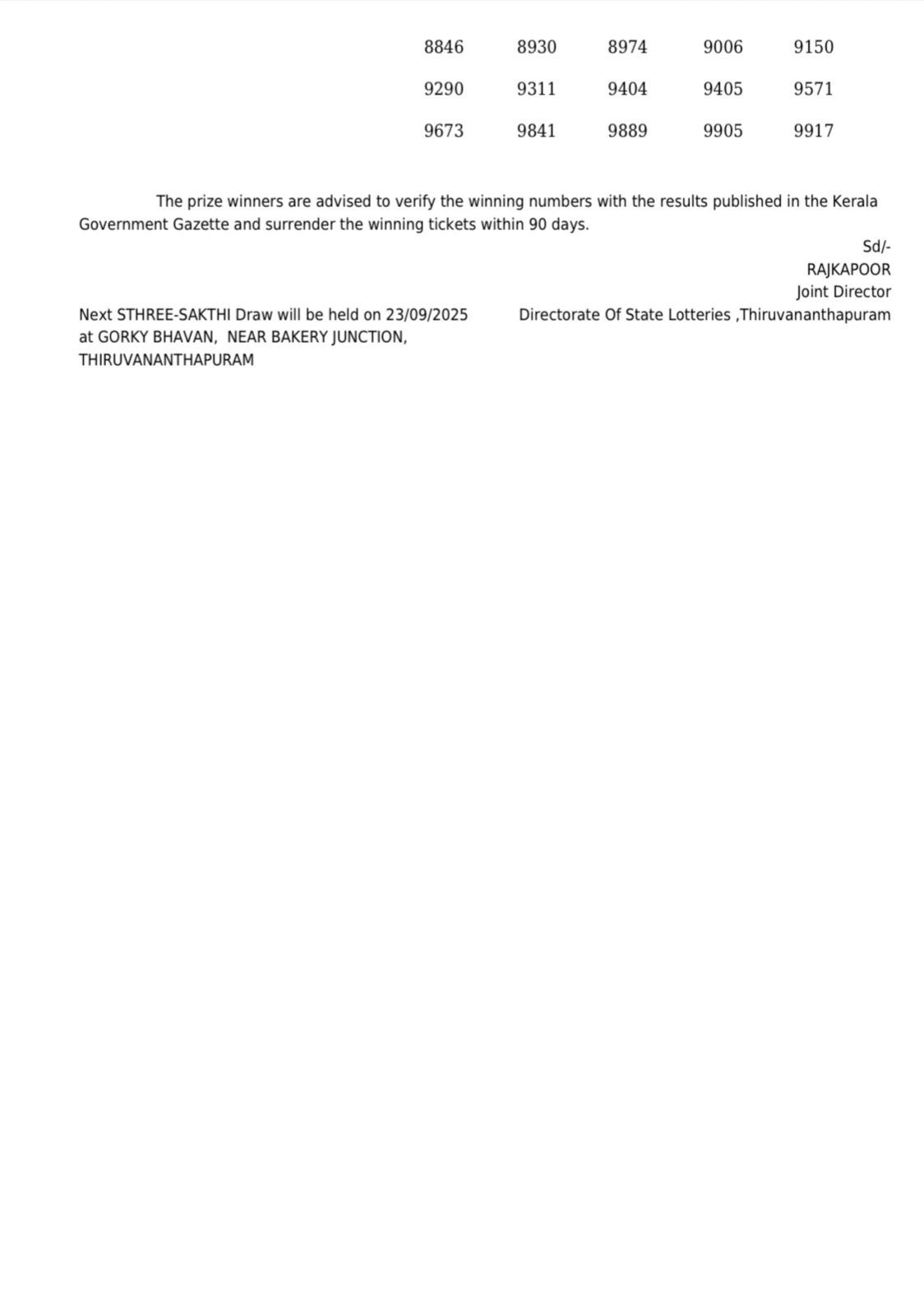 जरुरी सूचना: पुष्टि के लिए केरल सरकार के राजपत्र से सत्यापित करें। विजेता टिकट 90 दिनों के भीतर जमा करें। अगला STHREE-Sakthi ड्रा: 23/09/2025 को गोर्की भवन, तिरुवनंतपुरम में।