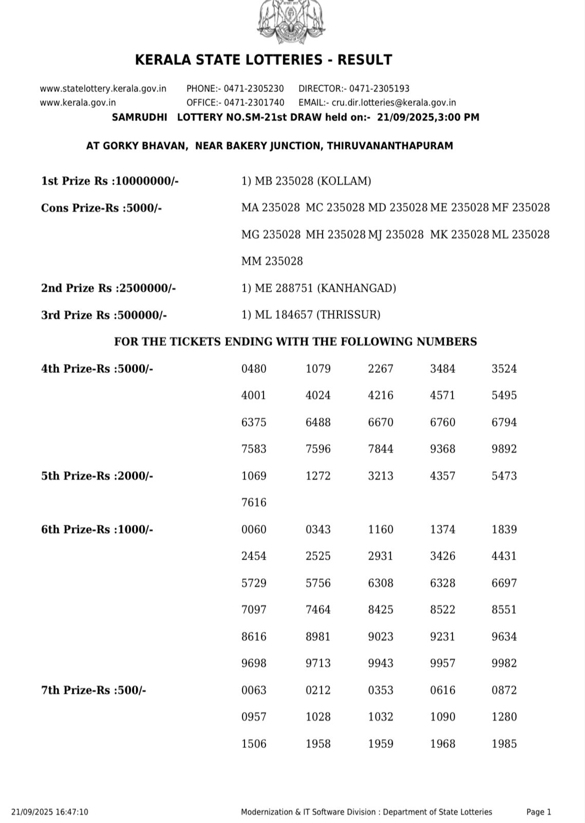 (LIVE) Lottery Sambad Kerala Result Today 21-09-2025: केरल राज्य लॉटरी की स्थापना 1967 में हुई थी, जिससे यह भारत का पहला राज्य बन गया जिसने लॉटरी विभाग शुरू किया गया। ये विभाग 7 साप्ताहिक लॉटरी और 6 बंपर लॉटरी प्रतिवर्ष आयोजित करता है, जिससे राज्य की विकास परियोजनाओं के लिए महत्वपूर्ण राजस्व प्राप्त होता है और हज़ारों लॉटरी एजेंटों को रोज़गार भी मिलता है।