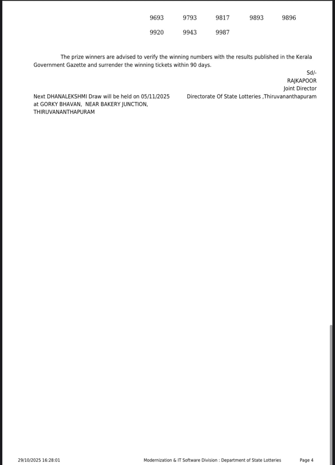 (OUT) Kerala Lottery Result Today 29-10-2025: सारे इनाम ड्रॉ की तारीख से 30 दिनों के भीतर क्लेम करने होते हैं। इसके लिए मूल टिकट और सभी जरूरी दस्तावेज़ साथ में होने चाहिए।