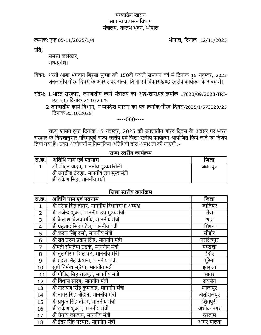 Janjatiya Gaurav Divas राज्य शासन के आदेश के अनुसार 15 नवंबर को जबलपुर और आलीराजपुर में राज्य स्तरीय कार्यक्रम आयोजित किए जाएंगे। इसके साथ ही जिला और ब्लॉक स्तर पर भी कार्यक्रम आयोजित किए जाएंगे। मुख्यमंत्री डॉ. मोहन यादव जबलपुर के कार्यक्रम में शामिल होंगे, जबकि सभी मंत्री अपने प्रभार वाले और गृह जिलों में आयोजित कार्यक्रमों में हिस्सा लेंगे। इसी तरह, सांसद, विधायक और जिला पंचायत अध्यक्ष भी अपने-अपने क्षेत्रों में आयोजित कार्यक्रमों में उपस्थित रहेंगे।