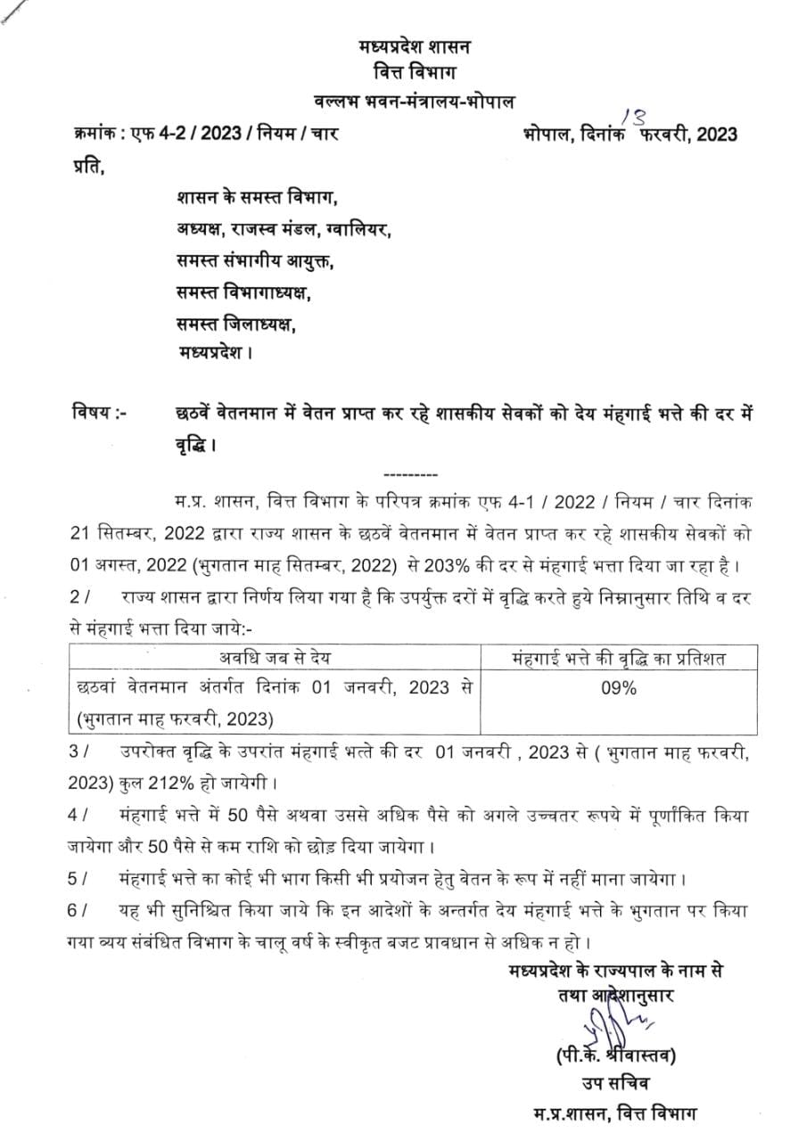 MP Employees DA hike: भोपाल। मध्यप्रदेश के कर्मचारियों के लिए बड़ी खबर। सरकारी कर्मचारियों का महंगाई भत्ता बढ़ा दिया गया है। जिसे लेकर वित्त विभाग द्वारा आदेश जारी कर दिया गया है। 6वां वेतनमान प्राप्त करने वाले कर्मचारियों का 9% DA में इजाफा किया गया है। कर्मचारियों को 1 जनवरी 2023 से बढ़ा हुआ 9% DA मिलेगा। गौरतलब है कि पहले 7वां वेतनमान प्राप्त कर्मचारियों का DA बढ़ा था। जिसमे सरकार ने कर्मचारियों का 4% डीए बढ़ाया था।