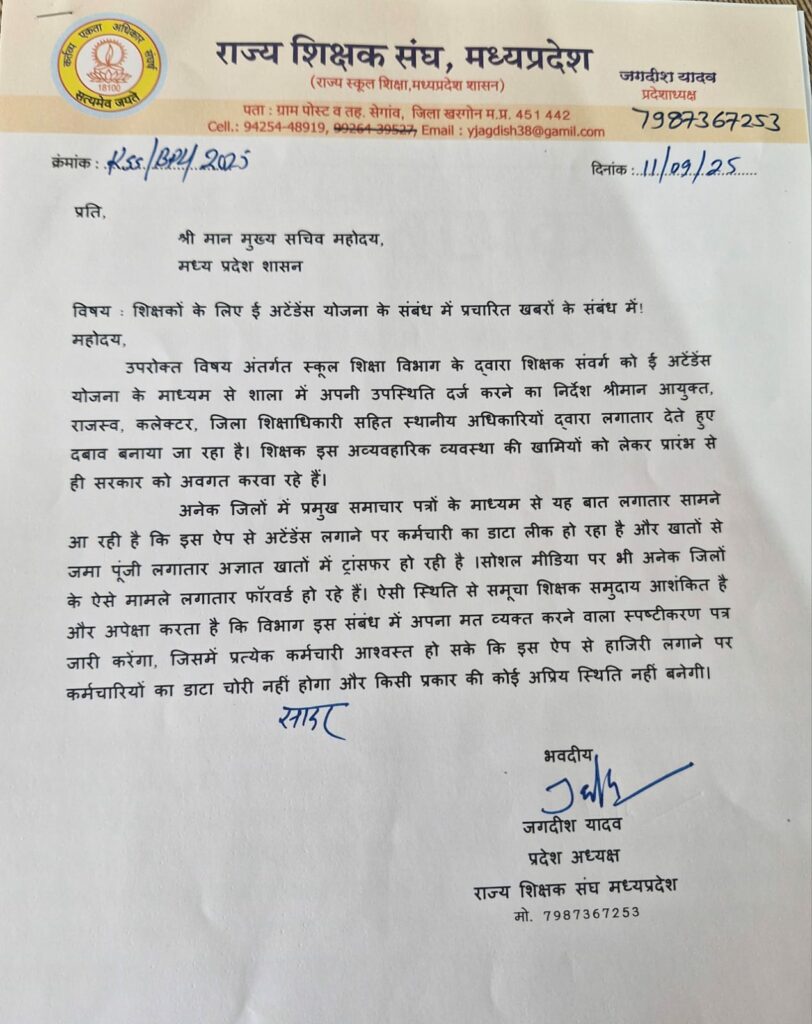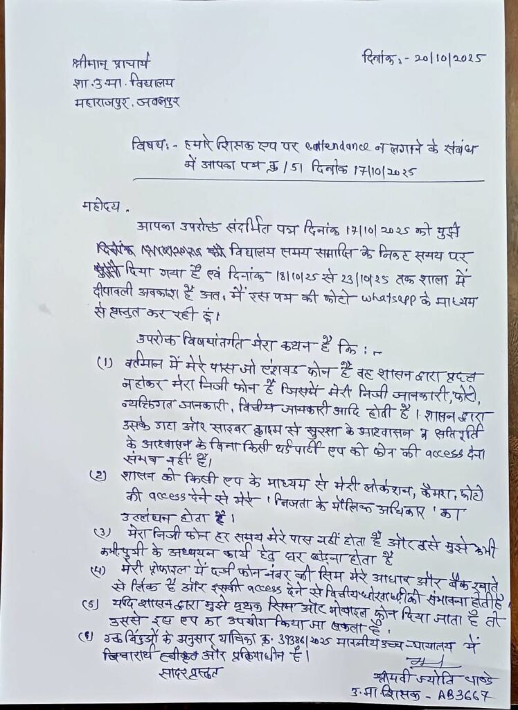E-attendance in schools, जबलपुर के शासकीय महाराजपुर स्कूल की एक शिक्षिका ज्योति पाण्डेय पत्र लिखा है। ये पत्र, ई अटैंडेंस ना लगाने पर शिक्षिका को थमाए गए शो कॉज़ नोटिस का जवाब है, जिसमें उन्होने ई अटैंडेंस ना लगाने के एक नहीं कई कारण गिना दिए हैं। अव्वल तो जवाब में ये कह दिया गया है कि शिक्षिका को सरकारी नहीं अपने निजी मोबाईल फोन से ई अटैंडेंस लगानी पड़ती है, जिससे उनके निजी फोटो वीडियो और डेटा लीक होने की आशंका है और ये उनके निजता के मौलिक अधिकार का उल्लंघन है।