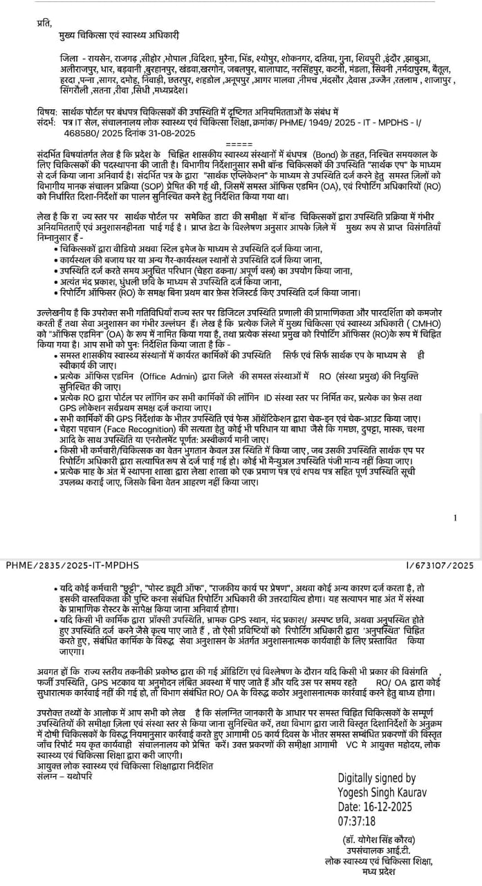 भोपाल से जारी पत्र के अनुसार सुसनेर सिविल अस्पताल और पीएचसी सोयतकलां में बांड डॉक्टरों की ऑनलाइन उपस्थिति नियमों के खिलाफ दर्ज की जा रही थी। जांच में धुंधली फोटो, पुराने वीडियो और बिना फेस ऑथेंटिकेशन के हाजिरी के मामले सामने आए हैं। सीएमएचओ ने सुसनेर के सीबीएमओ को मामले की जांच कर तत्काल रिपोर्ट देने के निर्देश दिए हैं।