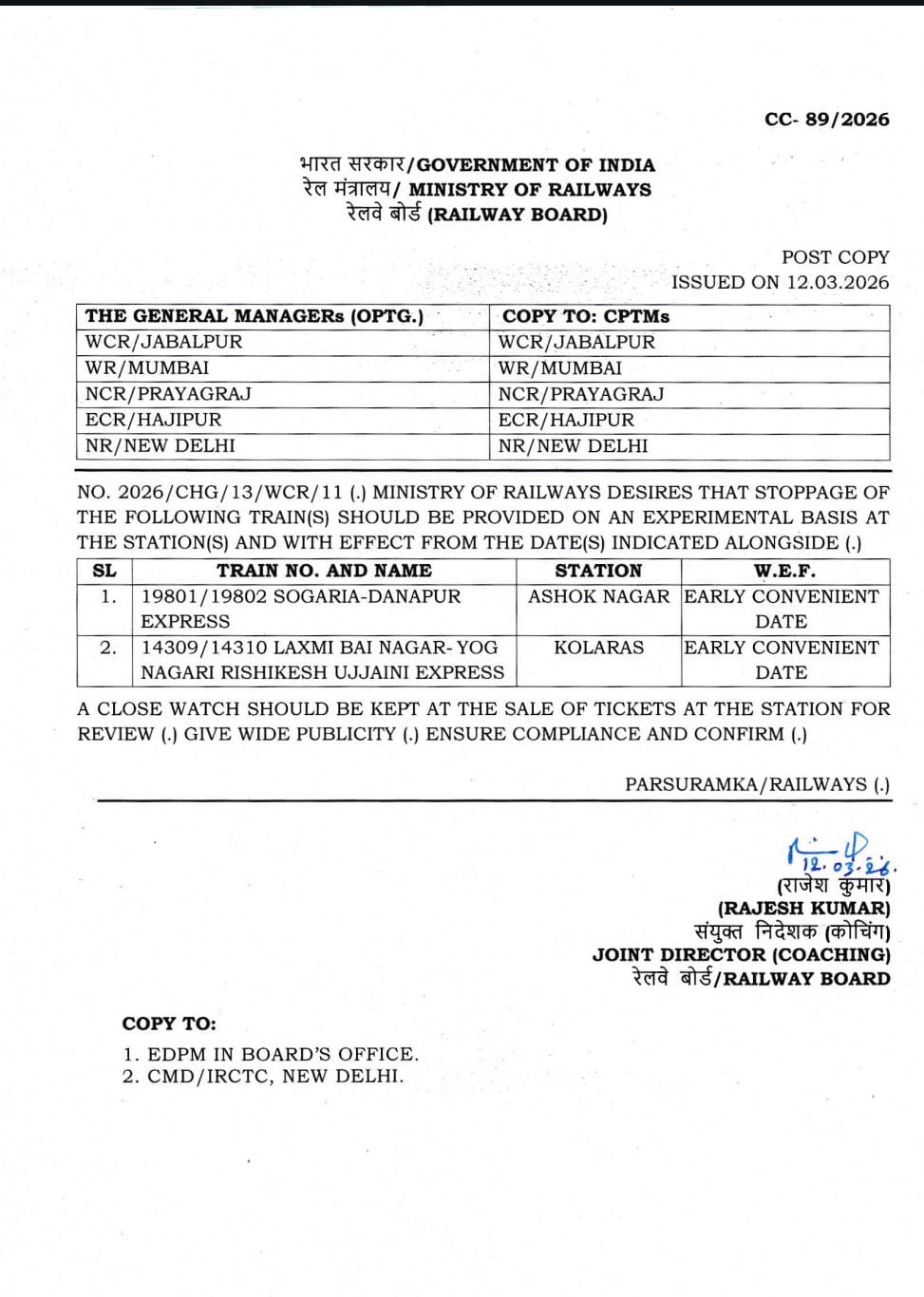 - अशोकनगर में सोगरिया–दानापुर एक्सप्रेस के स्टॉपेज को मंजूरी।