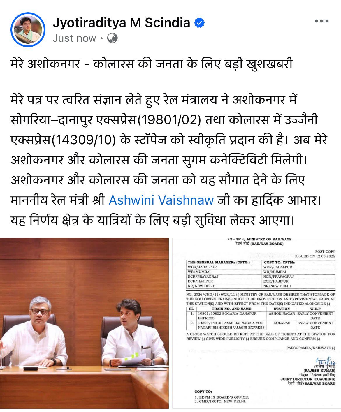 नई दिल्ली/अशोकनगर/शिवपुरी : Jyotiraditya Scindia Rail News केन्द्रीय संचार एवं पूर्वोत्तर क्षेत्र विकास मंत्री तथा गुना सांसद ज्योतिरादित्य सिंधिया के प्रयासों से अशोकनगर और कोलारस क्षेत्र की जनता को बेहतर रेल कनेक्टिविटी उपलब्ध कराने की दिशा में एक महत्वपूर्ण कदम उठाया गया है। Ashoknagar Railway Station, रेल मंत्रालय ने 12 मार्च को अशोकनगर में सोगरिया–दानापुर एक्सप्रेस (19801/02) तथा कोलारस में उज्जैनी एक्सप्रेस (14309/10) के स्टॉपेज को स्वीकृति दी है। यह निर्णय क्षेत्र के यात्रियों के लिए आवागमन को अधिक सुगम और सुविधाजनक बनाएगा। यह जानकारी केन्द्रीय मंत्री सिंधिया ने सोशल मीडिया फेसबुक पर पोस्ट कर साझा की है।