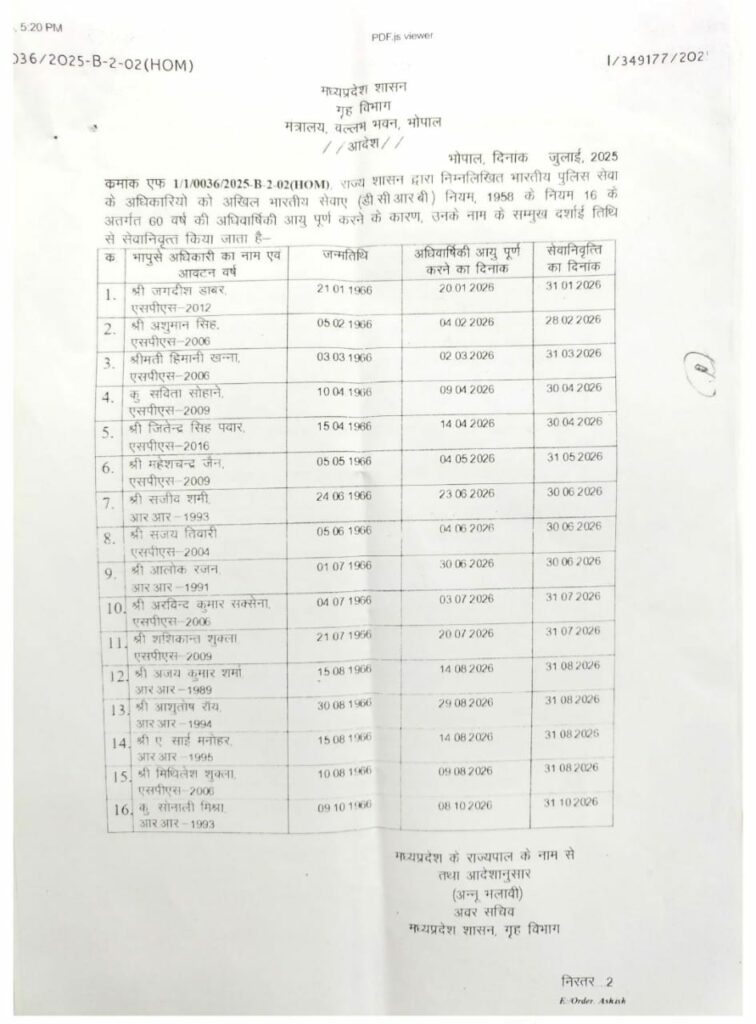 MP IPS News: 2026 में रिटायर्ड हो जाएंगे प्रदेश ये 16 IPS अधिकारी, राज्य सरकार ने जारी की सूची…देखें