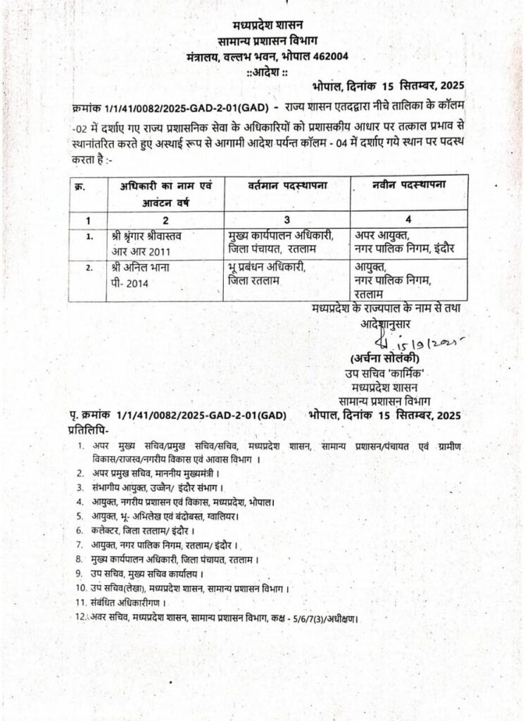 इसके पहले भी राज्य प्रशासनिक सेवा के दो अधिकारियों के तबादले किए गए थे। जिसमें रतलाम जिला पंचायत सीईओ श्रृंगार श्रीवास्तव का तबादला किया है। श्रृंगार श्रीवास्तव इंदौर नगर निगम के डिप्टी कमिश्नर बनाए गए हैं। वहीं अनिल भाना रतलाम नगर निगम आयुक्त बनाए गए हैं।