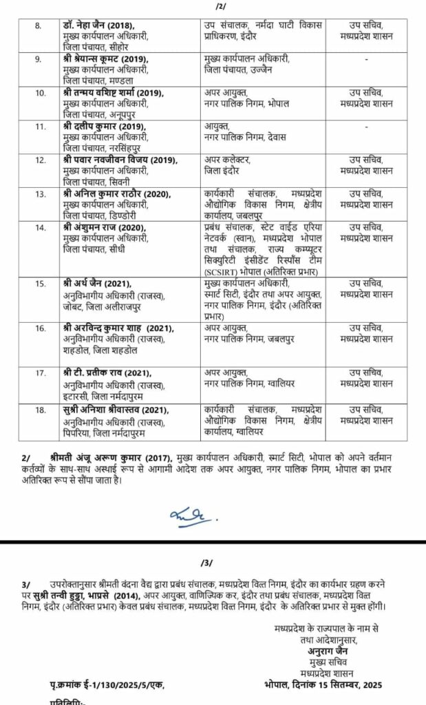 सामान्य प्रशासन विभाग द्वारा जारी आदेश के अनुसार विशेष गढ़पाले को मध्य प्रदेश शासन ऊर्जा विभाग का सचिव बनाया गया है। वहीं श्रीमती वंदना वैद्य को प्रबंध संचालक मध्य प्रदेश वित्त निगम इंदौर की जिम्मेदारी सौंप गई है। इनके अलावा गजेंद्र सिंह नागेश को मुख्य कार्यपालन अधिकारी, जिला पंचायत नरसिंहपुर और गुरु प्रसाद को उपसचिव, मुख्य सचिव कार्यालय की जिम्मेदारी दी गई है।