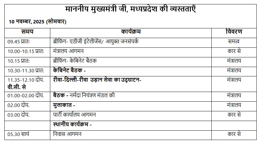 बता दें कि, सीएम डॉ मोहन यादव आज प्रातः 10.30 – 11.30: कैबिनेट की बैठक में शामिल होंगे। इसके बाद वे प्रातः 11.35 – 12.10: रीवा-दिल्ली-रीवा उड़ान सेवा का वीडियो कॉन्फ्रेंसिंग के जरिये उद्घाटन करेंगे। सीएम डॉ यादव दोपहर 01.00 से 02 बजे के बीच नर्मदा नियंत्रण मंडल की बैठक में शामिल होंगे, दोपहर 2 बजे वे मंत्रालय में आगुन्तकों से मुलाकात करेंगे जबकि 3 बजे पार्टी कार्यालय में उनका आगमन होगा। इसके पश्चात सीएम स्थानीय कार्यक्रमों में शिरकत करेंगे।