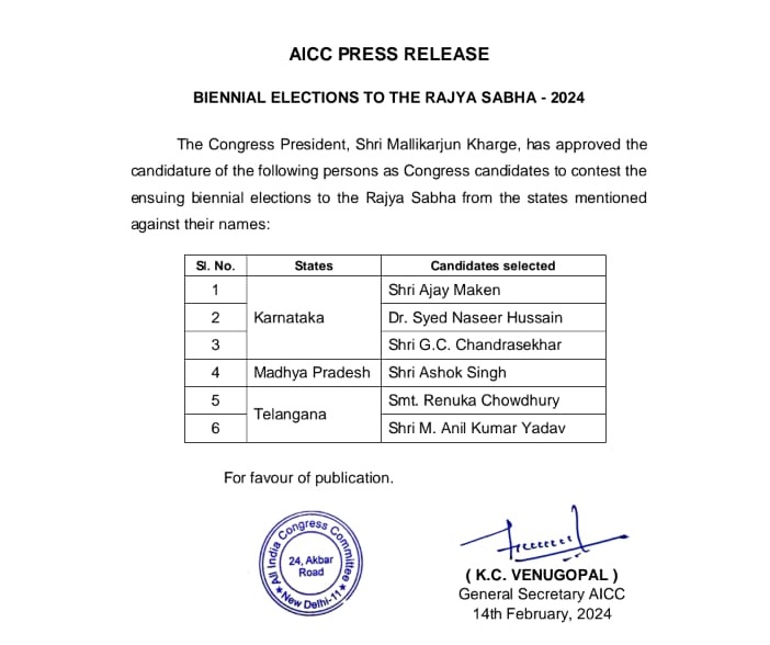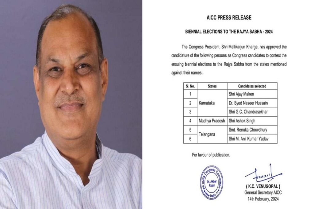 Rajya sabha election 2024: भोपाल। मध्यप्रदेश में कांग्रेस ने अपने राज्यसभा के लिए उम्मीदवार की घोषणा कर दी है। कांग्रेस ने अपनी ओर से अशोक सिंह को मध्यप्रदेश से राज्यसभा भेजने का ऐलान किया है। बता दें कि अशोक सिंह एमपी कांग्रेस के उपाध्यक्ष हैं। वहीं इसके साथ ही आज कांग्रेस ने अपनी दूसरी सूची में तीन राज्यों के लिए 6 उम्मीदवारों की घोषणा कर दी है। इसमें से कर्नाटक से तीन नाम तय किए गए हैं जिनमें अजय माकन, डॉक्टर सैयद नासिर हुसैन और जी सी चंद्रशेखर का नाम शामिल है।