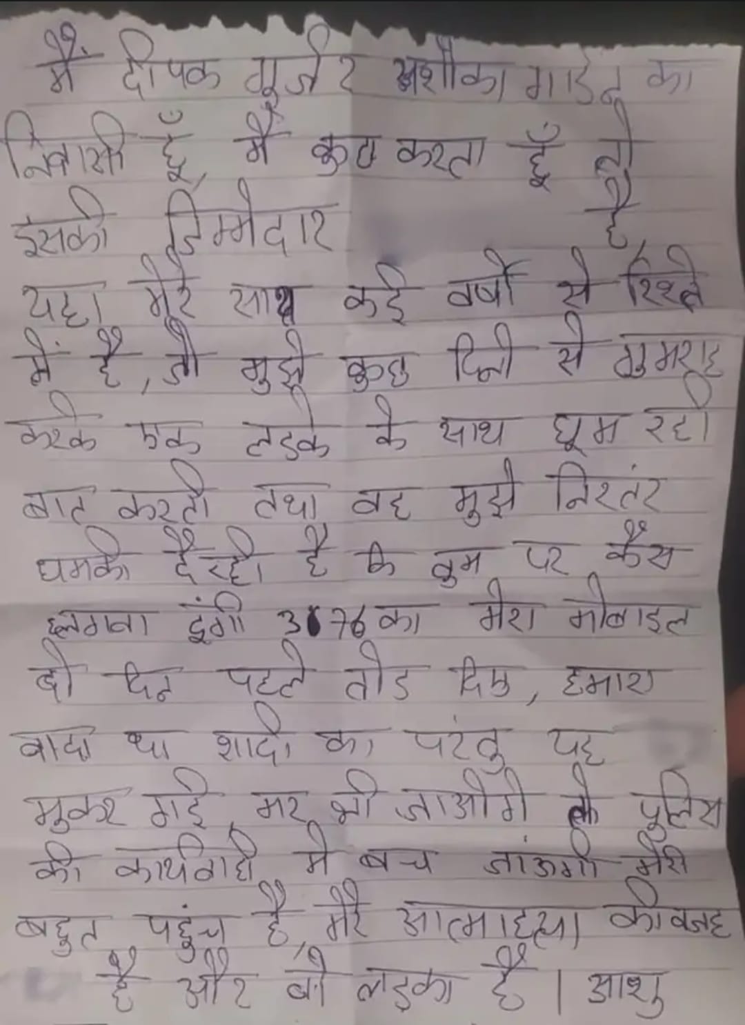 युवक ने सुसाइड नोट में लिखा— “मैं दीपक गुर्जर, अशोका गार्डन का निवासी, अपने फैसलों के लिए अपनी प्रेमिका को जिम्मेदार मानता हूं। माही मेरे साथ कई सालों से रिलेशन में है। हमने शादी का वादा किया था, लेकिन अब यह मुझे गुमराह कर रही है, दूसरे लड़के के साथ घूमती है और उससे बात करती है। जब मैं कुछ कहता हूँ तो धमकाती है कि जेल भेज दूंगी और रेप का केस लगवा दूंगी। उसने दो दिन पहले मेरा मोबाइल भी तोड़ दिया। हमारी शादी का वादा था, लेकिन उसने इनकार कर दिया। वह कहती है कि तुम मर भी जाओ तो मेरा कुछ नहीं होगा, मैं बच जाऊंगी।”