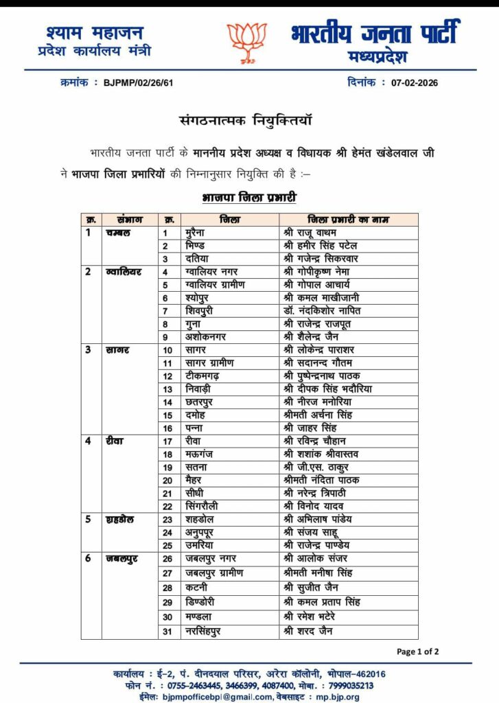 भोपाल: मध्यप्रदेश भाजपा इकाई में पदाधिकारियों की नियुक्तियों का सिलसिला जारी है। (BJP District Incharge Name List) प्रदेश प्रमुख हेमंत खण्डेलवाल संगठन की मजबूती के लिए लगातार सक्रिय नेताओं जिम्मेदारियां सौंप रहें हैं।