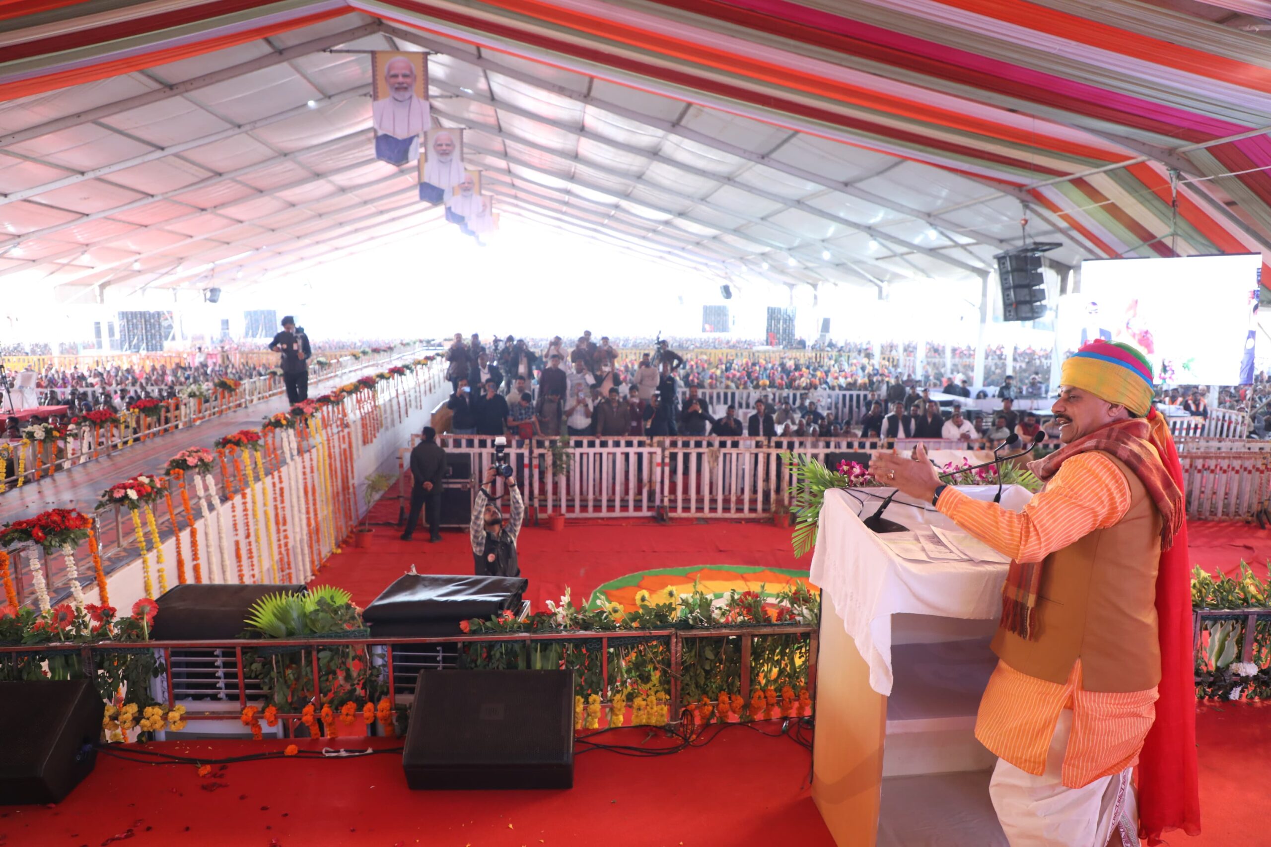मुख्यमंत्री डॉ. यादव ने कहा कि प्रदेश की सभी पात्र महिलाओं को लाड़ली बहना योजना का लाभ मिल रहा है। हमारी सरकार में मुख्यमंत्री लाड़ली बहना योजना की राशि बढ़ाकर 1500 रुपए की गई है। बहनों को हर माह यह राशि ट्रांसफर की जा रही है। प्रदेश की धरती पर भगवान श्रीराम और श्रीकृष्ण से जुड़े सभी स्थानों को हम तीर्थ के रूप में विकसित कर रहे हैं। मुख्यमंत्री ने कहा कि राज्य सरकार ने प्रदेश के युवाओं को एक लाख नौकरियां देने का वादा किया था। इसमें से अब तक 60 हजार पदों पर भर्ती की जा चुकी है। अगले पांच साल में प्रदेश के ढाई लाख पदों पर नई नौकरियां दी जाएंगी। उन्होंने कहा कि मंदसौर और नीमच में मेडिकल कॉलेज पहले ही बन चुके हैं। बहनों को रोजगार से जोड़ने के लिए हमने मंदसौर को नर्सिंग कॉलेज की सौगात भी दी है।