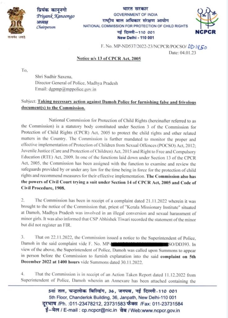 Damoh dharmantaran latest update: आयोग ने दमोह एसपी समेत अन्य अधिकारियों पर एक्शन लेने का निर्देश भी दिया। साथ ही डीजीपी को यह भी निर्देश दिया कि मामले में अब सात दिनों के अंदर रिपोर्ट भी पेश करनी होगी। बता दें कि राष्ट्रीय बाल अधिकार संरक्षण आयोग के अध्यक्ष प्रियंक कानूनगो ने दमोह में ईसाई मिशनरी द्वारा संचालित आधारशिला के बाल भवन, मिड इंडिया और भिड़ावरी के पास संचालित बाल गृहों का निरीक्षण किया था। मामले में गड़बड़ी मिलने पर उन्होंने मिशनरी के 10 संचालकों के खिलाफ धर्मांतरण सहित अनेक धाराओं में देहात थाना में मामला दर्ज कराया था।