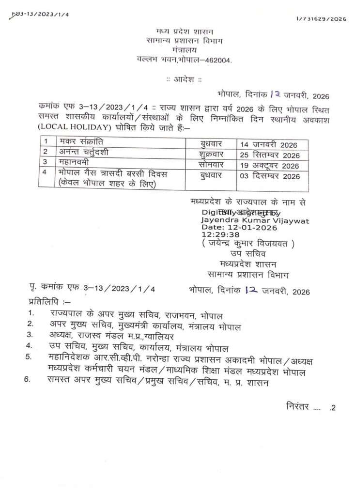 जारी आदेश के मुताबिक़ 14 जनवरी मकर संक्रांति, 25 सितम्बर अनंन्त चर्तुदशी, 18 अक्टूबर महानवमी और 3 दिसम्बर 2026 को भोपाल गैस त्रासदी बरसी दिवस (सिर्फ भोपाल) (Public Holiday Order Issued) पर स्थानीय अवकाश का ऐलान किया गया है।
