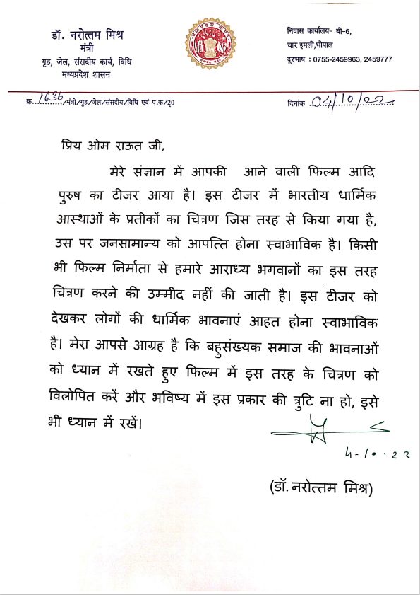 HM wrote a letter to the director of the film Adipurush: गृहमंत्री नरोत्तम मिश्रा ने पत्र लिखकर इस फिल्म में समाजिक भावनाओ को ध्यान में रखकर फिल्म के गलत चित्रण को हटाने की मांग की है। ‘आदिपुरुष’ को लेकर मध्यप्रदेश के गृहमंत्री नरोत्तम मिश्रा ने कहा है कि इस फिल्म में हिंदू धर्म की आस्था पर कुठाराघात और धार्मिक भावना को आहत करने वाले कई आपत्तिजनक सीन हैं। नरोत्तम मिश्रा ने पत्र में लिखा है किसी फिल्म में हमारे आराध्यों के इस तरह के चित्रण की उम्मीद नहीं की जा सकती। फिल्म में इस तरह के चित्रण को विलोपित करें और भविष्य में इस तरह की त्रुटि न हो इसको भी ध्यान में रखें।