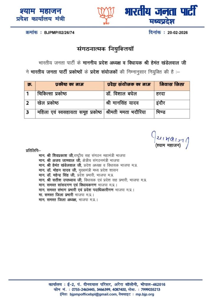 भोपाल: भारतीय जनता पार्टी ने अपने संगठन को मजबूत करते हुए तीन प्रकोष्ठों के प्रदेश संयोजकों की घोषणा की है। यह घोषणा पार्टी के प्रदेश अध्यक्ष हेमंत खंडेलवाल द्वारा की गई। (MP BJP State Latest Appointments) जारी जानकारी के अनुसार चिकित्सा प्रकोष्ठ, खेल प्रकोष्ठ और महिला एवं स्व सहायता समूह प्रकोष्ठ के लिए नए प्रदेश संयोजकों की नियुक्ति की गई है। इन नियुक्तियों को संगठन विस्तार और कार्यकर्ताओं को नई जिम्मेदारी देने के तौर पर देखा जा रहा है।
