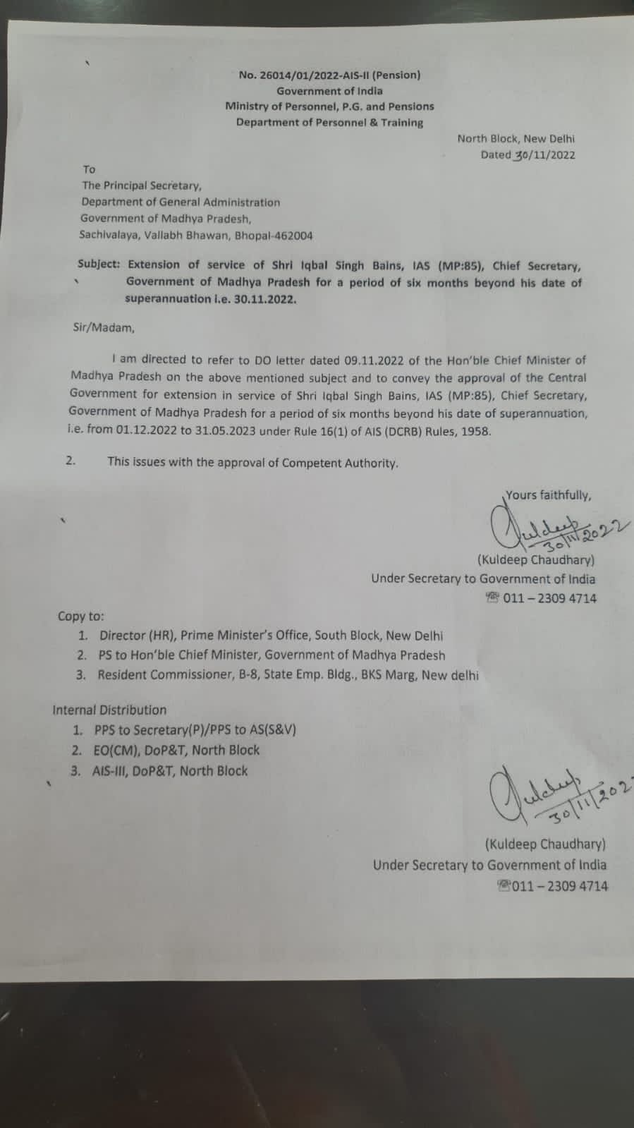 madhya pradesh latest news : भोपाल। IBC24 की खबर पर मुहर। मध्य प्रदेश के मुख्य सचिव इकबाल सिंह बैंस का कार्यकाल 6 महीने के लिए बढ़ाया गया। आज रिटायर होने वाले थे मध्य प्रदेश के मुख्य सचिव इकबाल सिंह बैंस। सेवा काल में 6 महीने की हुई वृद्धि।