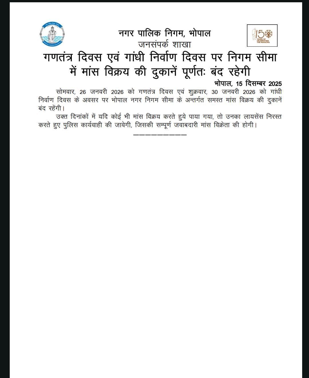 नगर निगम द्वारा जारी आदेशों के अनुसार, अगर कोई दुकानदार या व्यक्ति इन तय तारीखों पर मांस की बिक्री करता पाया गया, तो उसके खिलाफ सख्त कानूनी कार्रवाई की जाएगी। नियमों का उल्लंघन करने पर संबंधित दुकानदार का लाइसेंस तत्काल निरस्त किया जाएगा, वहीं दोषी व्यक्ति के विरुद्ध पुलिस कार्रवाई भी सुनिश्चित की जाएगी। प्रशासन ने साफ कर दिया है कि किसी भी तरह की लापरवाही या नियम तोड़ने वालों को बख्शा नहीं जाएगा।