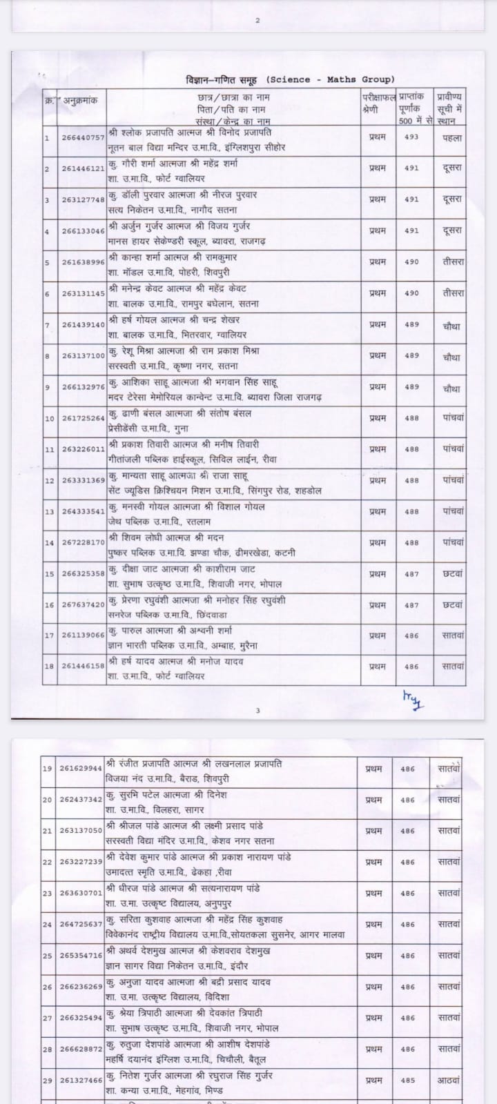 मध्य प्रदेश माध्यमिक शिक्षा मंडल (MP Board) के विज्ञान-गणित समूह के टॉपर्स की सूची जारी हो गई है, जिसमें प्रदेश के होनहार विद्यार्थियों ने शानदार प्रदर्शन किया है। इस साल टॉप स्थान पर श्री हर्ष प्रजापति ने 500 में से 493 अंक हासिल कर पहला स्थान प्राप्त किया। वहीं दूसरे स्थान पर कु. गौरी शर्मा, कु. डॉली प्रजापति और श्री अर्जुन गुर्जर ने 491 अंक के साथ संयुक्त रूप से जगह बनाई। तीसरे स्थान पर श्री कार्तिक शर्मा और श्री मन्नेज केवट ने 490 अंक हासिल कर अपनी प्रतिभा का लोहा मनवाया।