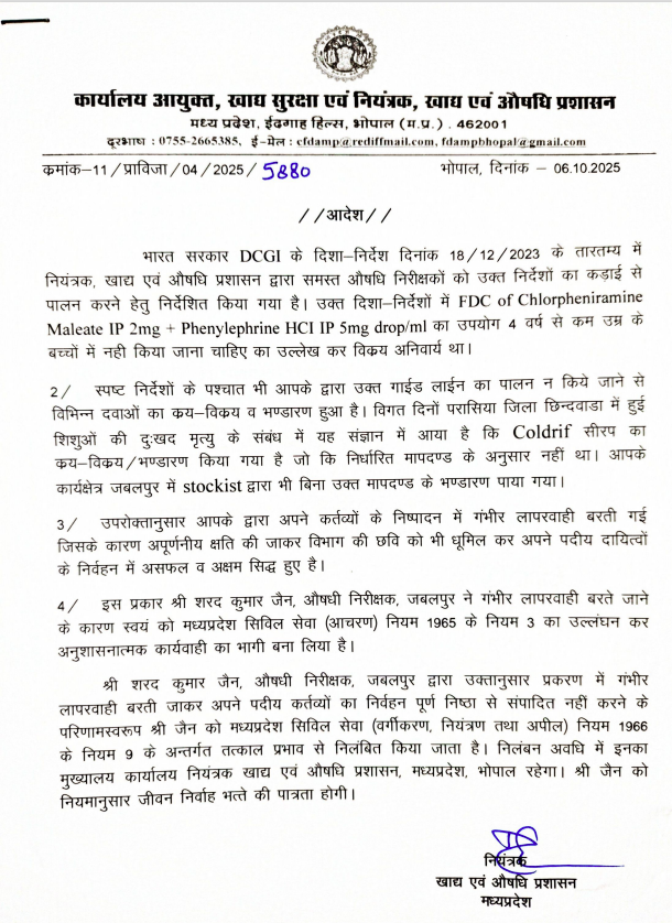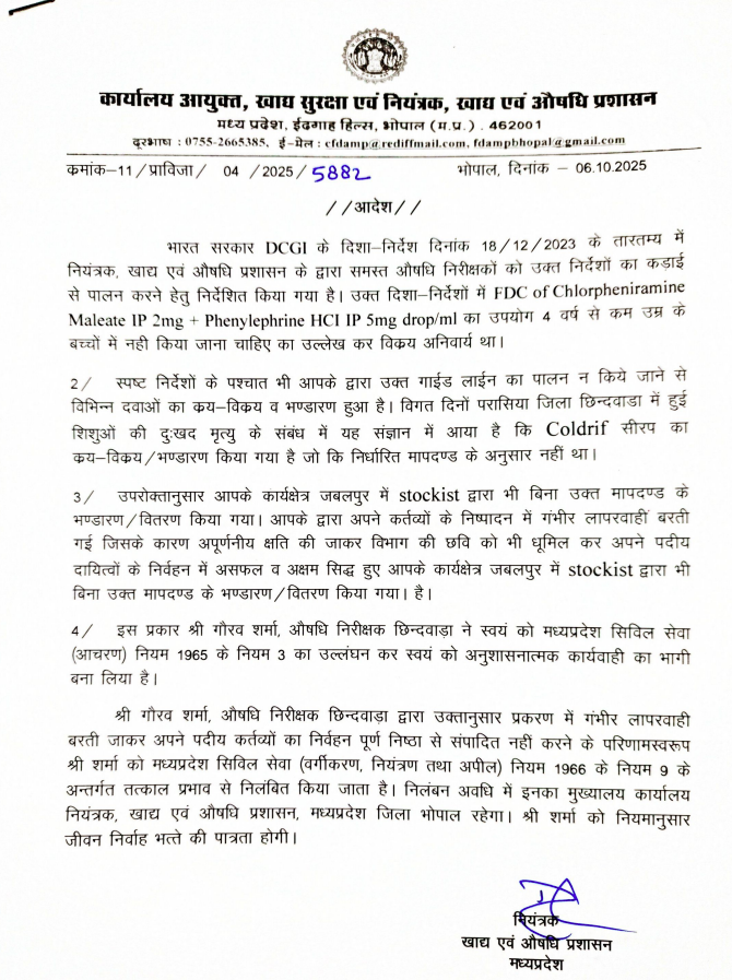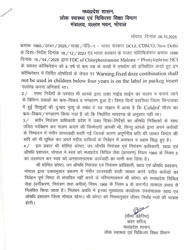 मुख्यमंत्री डॉ. यादव ने सोमवार को मुख्यमंत्री निवास पर इस विषय में उच्चस्तरीय बैठक बुलाई, जिसमें संबंधित विभागों को आवश्यक दिशा-निर्देश जारी किए गए। बैठक के बाद हुई कार्रवाई के तहत तीन अधिकारियों को निलंबित कर दिया गया है और एक वरिष्ठ अधिकारी का तबादला किया गया है। शोभित कोष्टा, उप औषधि नियंत्रक एवं नियंत्रण प्राधिकारी, औषधि प्रशासन, भोपाल, शरद जैन औषधि निरीक्षक, जबलपुर और गौरव शर्मा औषधि निरीक्षक, छिंदवाड़ा साथ ही ड्रग कंट्रोलर दिनेश मौर्य को अन्यत्र स्थानांतरित कर दिया गया है।