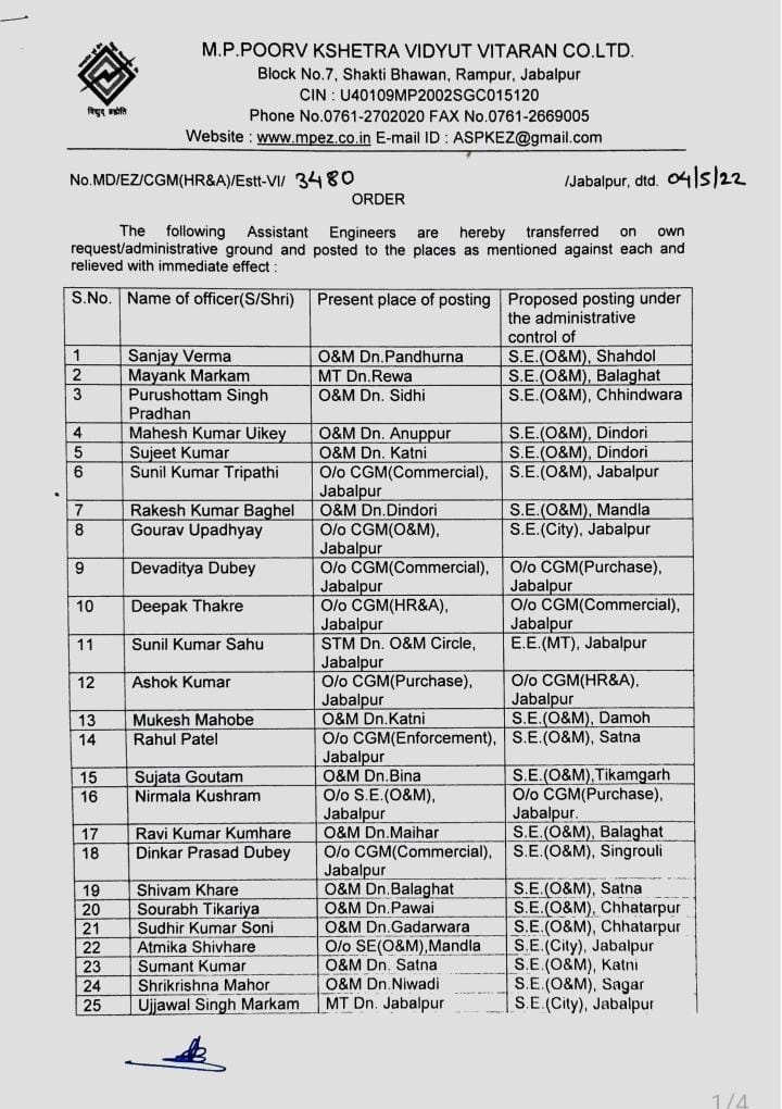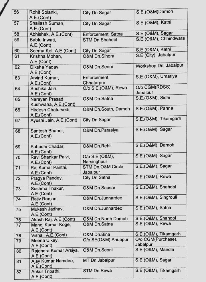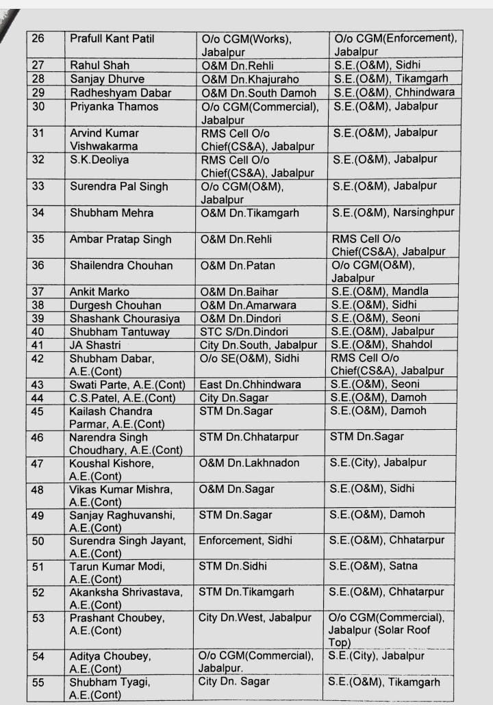 मध्यप्रदेश विद्युत विभाग में बंपर तबादले, 89 असिस्टेंट इंजीनियर्स को किया गया इधर से उधर, देखें पूरी सूची
