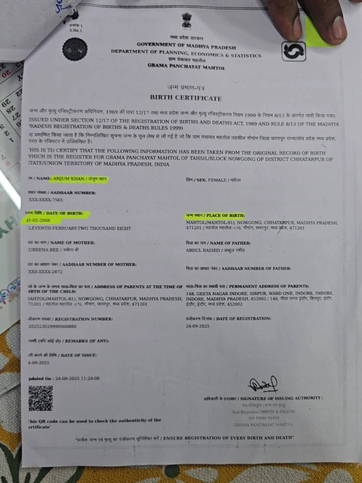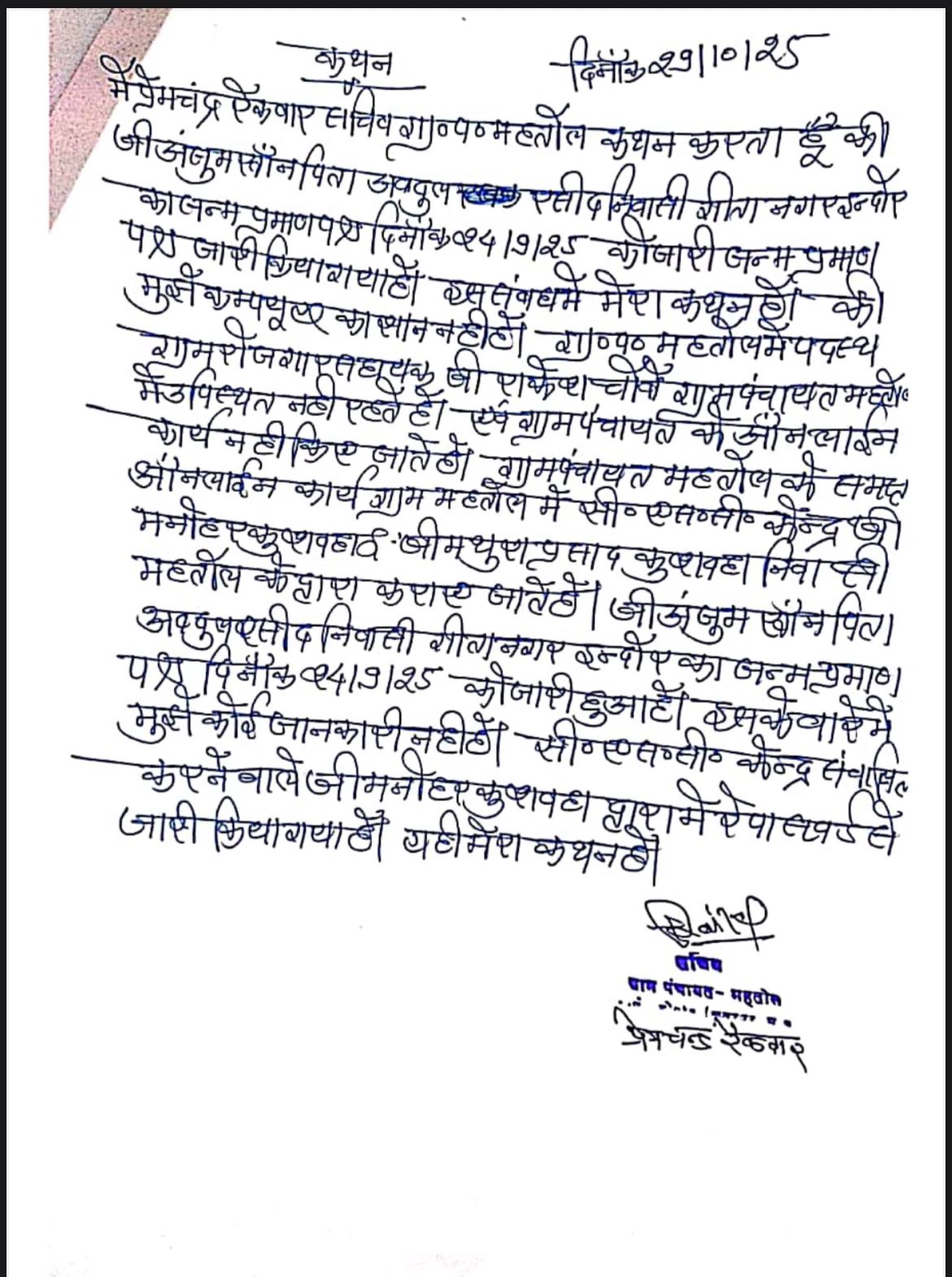 जिला पंचायत के सीईओ ने बताया कि महतौल गांव में एक भी मुसलमान न होने के बावजूद इंदौर के एक मुसलमान के बच्चे का जन्म प्रमाण-पत्र जारी किया गया। प्रारंभिक आशंका है कि इसी तरह रोहिंग्या मुसलमानों के भी प्रमाण-पत्र जारी किए गए हैं जिसकी पुष्टि जांच के बाद होगी। महतौल के सचिव ने नियमों की अवहेलना करते हुए पिछले डेढ़ साल में लगभग साढ़े 1,100 जन्म प्रमाण-पत्र जारी किए। उदाहरण के लिए, इंदौर के गीतानगर निवासी अंजुम खान का जन्म 11 फरवरी 2008 को हुआ था,लेकिन उसका जन्म प्रमाण-पत्र 24 सितंबर 2025 को जारी किया गया।