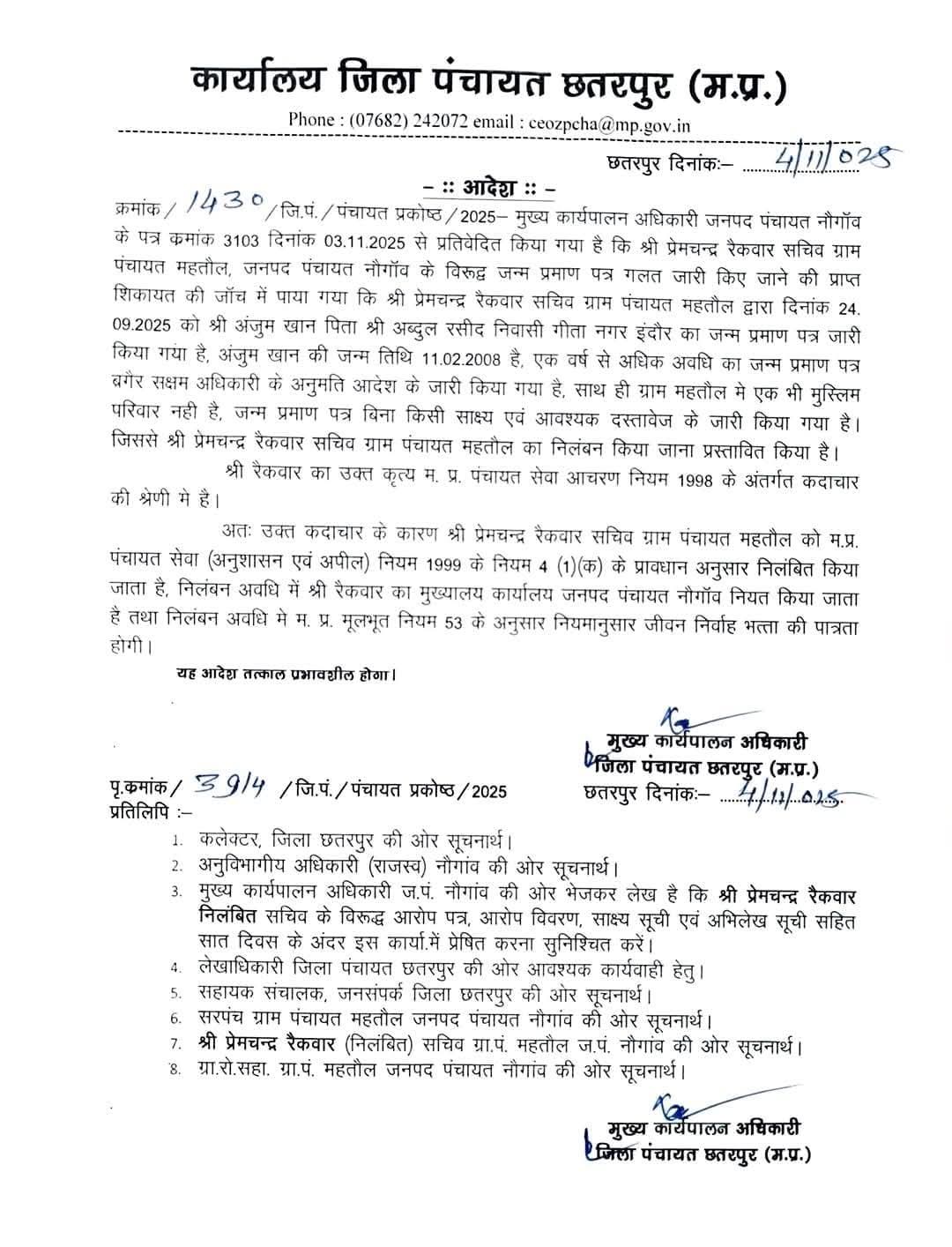 Chhatarpur News: नियमों के अनुसार, जन्म से एक साल बाद किसी का जन्म प्रमाण-पत्र जारी करने के लिए तहसीलदार का आदेश आवश्यक होता है। इस पर जिला पंचायत के सीईओ ने नौगांव के जनपद पंचायत सीईओ के नेतृत्व में तीन सदस्यीय जांच दल को मामले की जांच के आदेश दिए। जांच की गंभीरता को देखते हुए महतौल के सचिव प्रेमचंद्र रैकवार को तत्काल प्रभाव से निलंबित कर दिया गया और उनकी आईडी से पिछले डेढ़ साल में बने सभी जन्म प्रमाण-पत्रों की पड़ताल के आदेश भी जारी किए गए हैं।