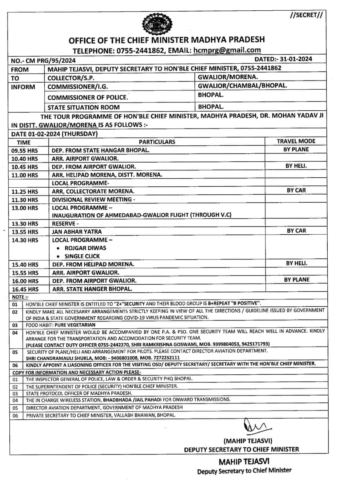CM Dr. Mohan Yadav Thursday Schedule : भोपाल। मध्यप्रदेश के मुख्यमंत्री डॉ. मोहन यादव चंबल दौरे पर हैं। मुख्यमंत्री डॉ मोहन यादव सुबह 10.45 बजे स्टेट हैंगर भोपाल से रवाना होके एयरपोर्ट ग्वालियर आयेगे। एयरपोर्ट ग्वालियर से रवाना होके सुबह 11 बजे हेलीपेड मुरैना जिला मुरैना आयेगे।