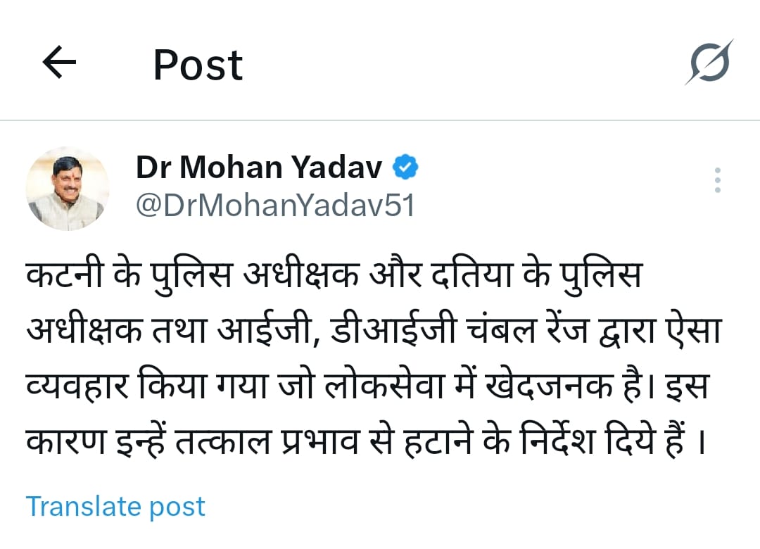 MP News उन्होंने अपने सोशल मीडिया मंच एक्स पर लिखा कि कटनी के पुलिस अधीक्षक और दतिया के पुलिस अधीक्षक तथा आईजी, डीआईजी चंबल रेंज द्वारा ऐसा व्यवहार किया गया, जो लोकसेवा में खेदजनक है। इस कारण इन्हें तत्काल प्रभाव से हटाने के निर्देश दिये हैं। बताया जा रहा है कि दतिया में SP और IG और DIG के बीच एयरपोर्ट के भीतर भीड़ घुसने की बात पर बहस हुई थी। सीएम को इस बात की जानकारी मिलने के बाद सभी अधिकारियों को हटा दिया है।