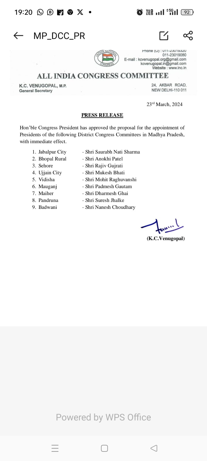 भोपालः New District President in MP Congress तारीखों के ऐलान के बाद सभा राजनीतिक पार्टियां लोकसभा चुनाव की तैयारियों में जुट गई है। कई जगहों पर नई नियुक्तियों का दौर भी जारी है। इसी बीच अब मध्यप्रदेश कांग्रेस में बड़ा फेरबदल हुआ है। कांग्रेस ने कई जिलों के पार्टी अध्यक्षों को बदल दिया है। नौ जिलों में जिलाध्यक्षों की नियुक्ति हुई है। इस संबंध में कांग्रेस के राष्ट्रीय महासचिव केसी वेणुगोपाल ने आदेश जारी कर दिया है।