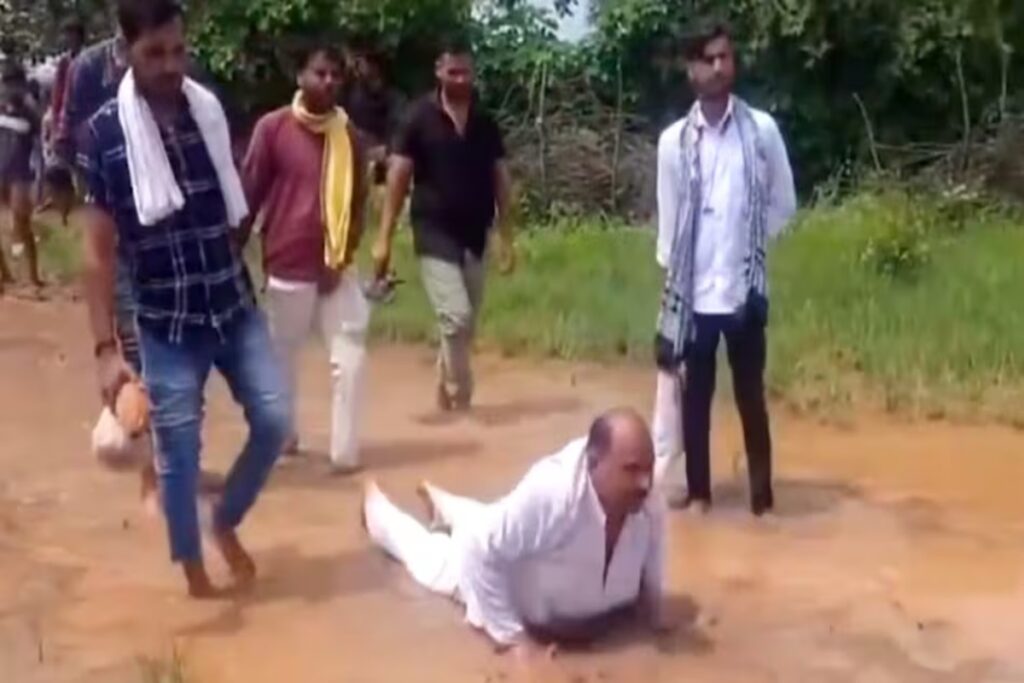 पन्नाः MP Viral Video: मध्यप्रदेश के पन्ना जिले के बदहाल सड़कों को लेकर कांग्रेस नेता अनिल तिवारी ने अनोखा प्रदर्शन किया है। उन्होंने कीचड़ भरी सड़कों पर दंडवत यात्रा की, जिसमें वे कीचड़ में लेटते हुए आगे बढ़े। इतना ही नहीं उन्होंने प्रशासन की ओर से कोई नहीं किए जाने पर गौमाता को ज्ञापन सौंपा। इस दौरान उनके समर्थक उनका उत्साह बढ़ा रहे थे। इस प्रदर्शन ने न सिर्फ स्थानीय लोगों का ध्यान खींचा, बल्कि सोशल मीडिया पर भी लोगों के बीच चर्चा का विषय बन गया।